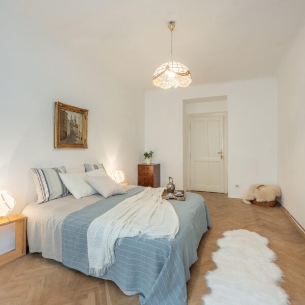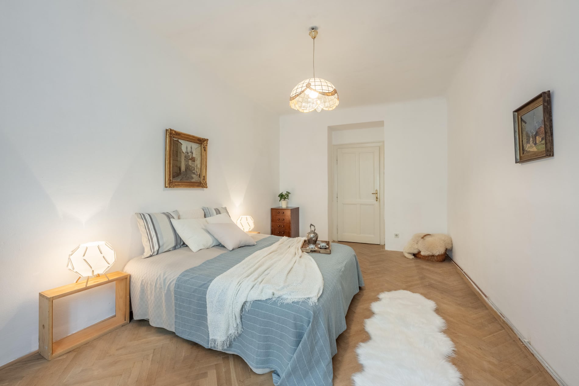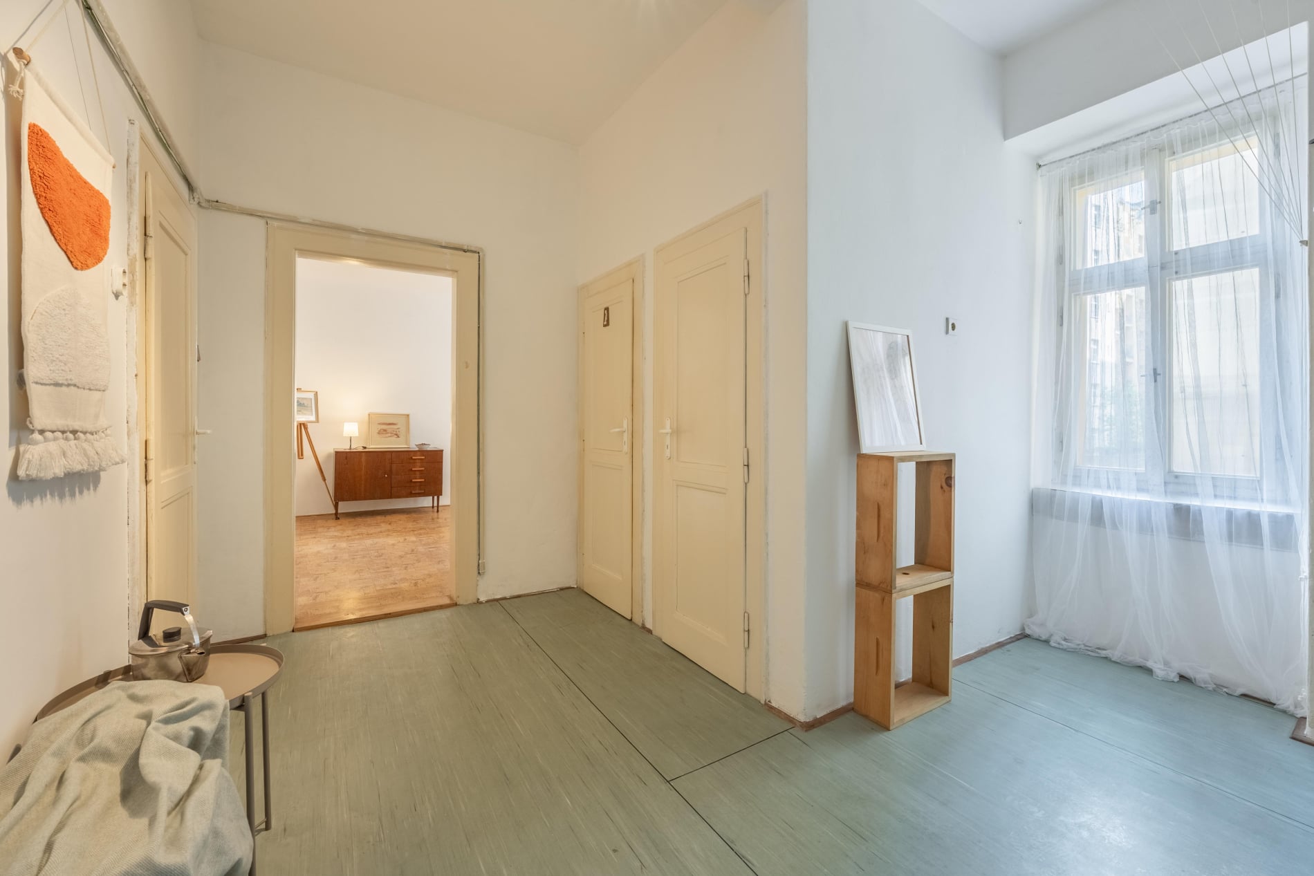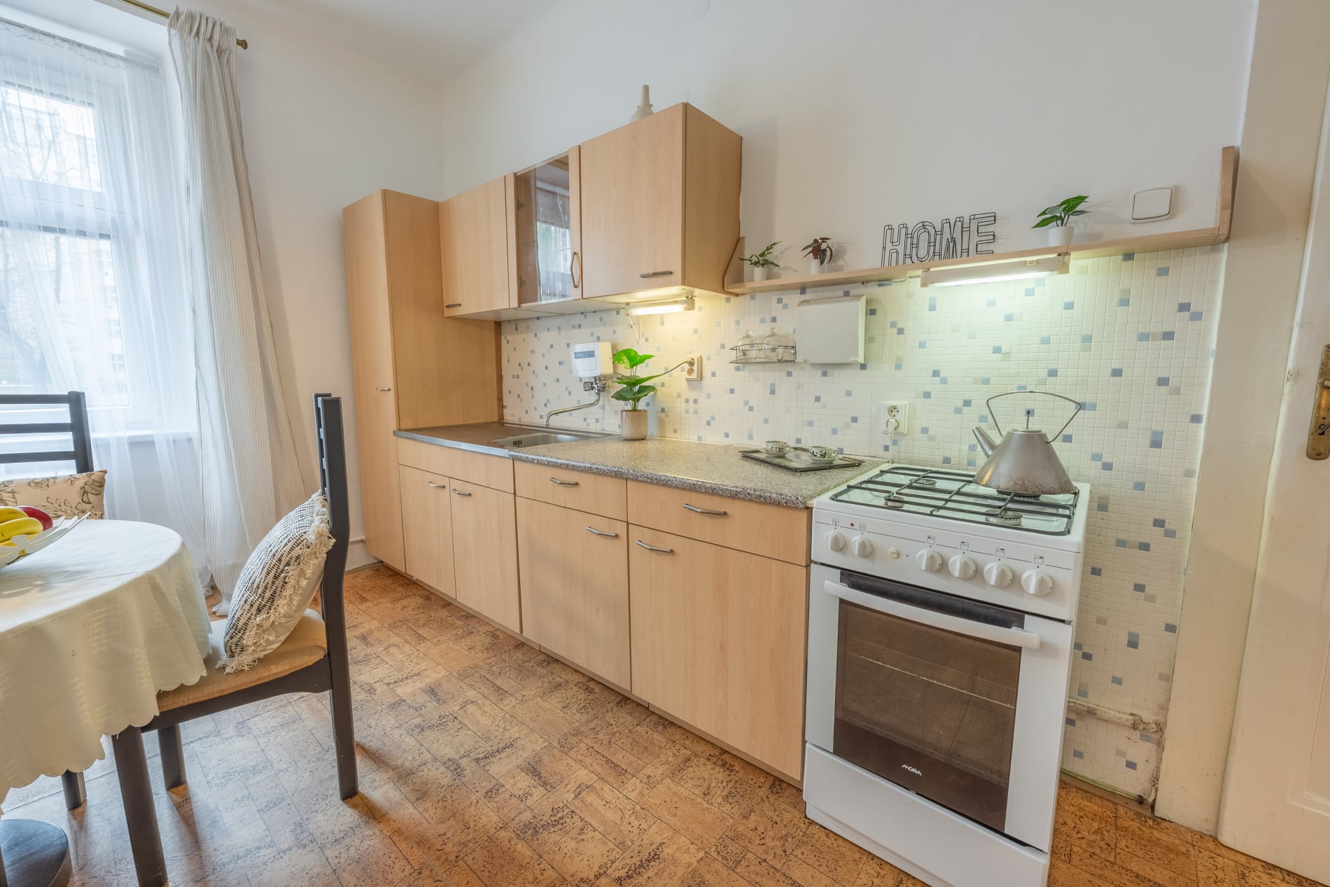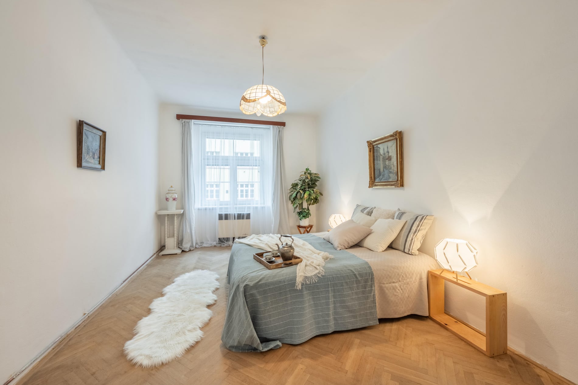 V zastoupení majitele Vám nabízím pěkný byt v krásně opraveném domě v horní části Žižkova – roh Žerotínova a Hájkova. Plocha bytu je 57m2 plus sklep 3 metry. Byt je ve zvýšeném přízemí s parapety dostatečně vysoko díky několika schoodům a svahu. Pod bytem je obydlený ateliér nikoliv sklepy. Dům má pěkný dvorek, který je obyvateli užíván a kde probíhají snahy o pěstování okrasné zeleně.