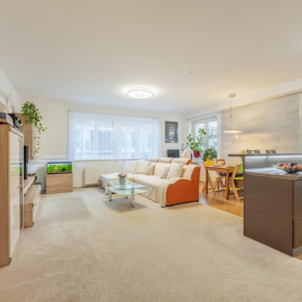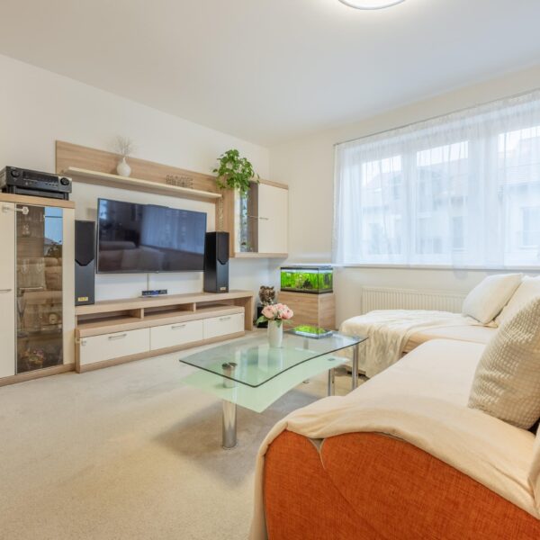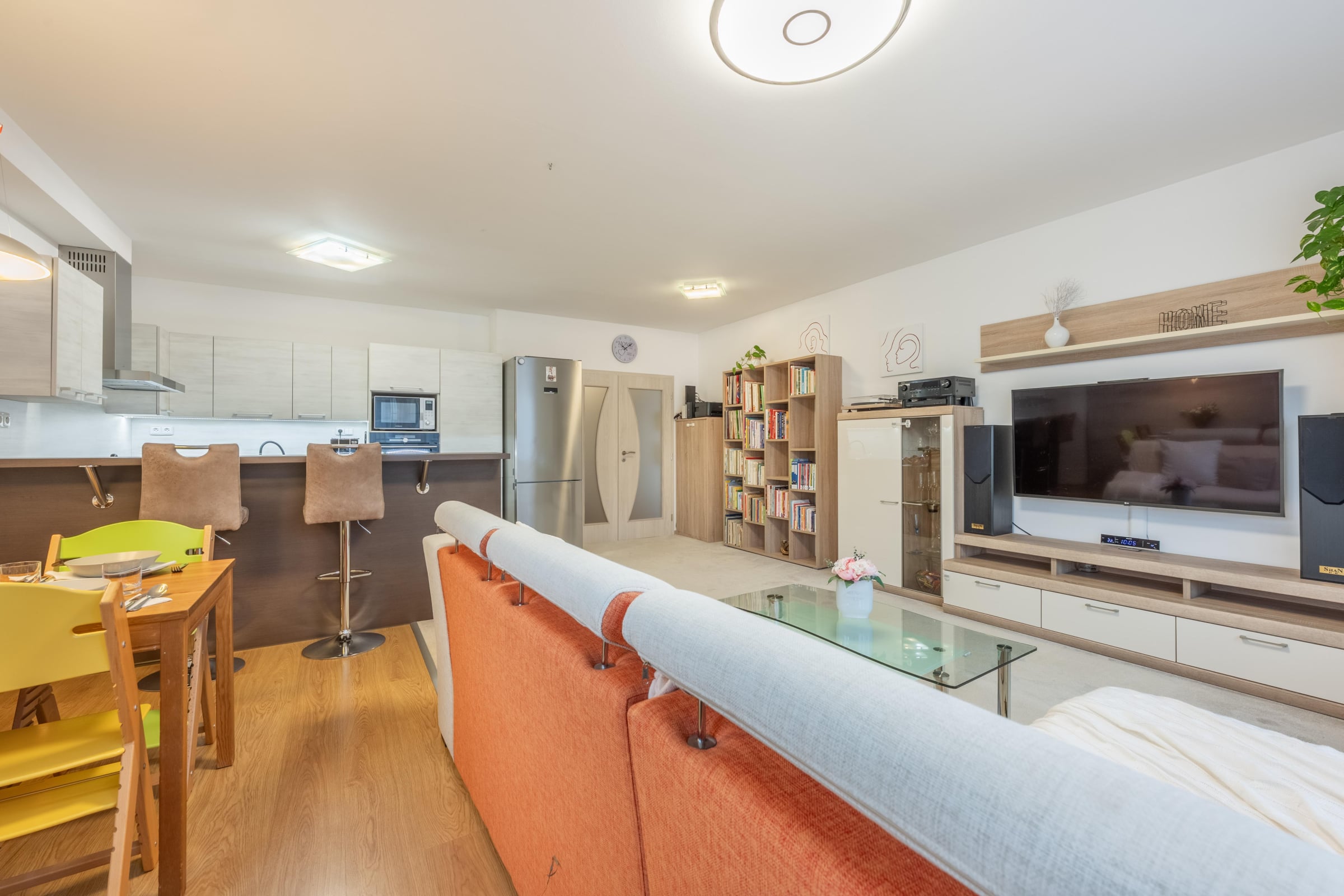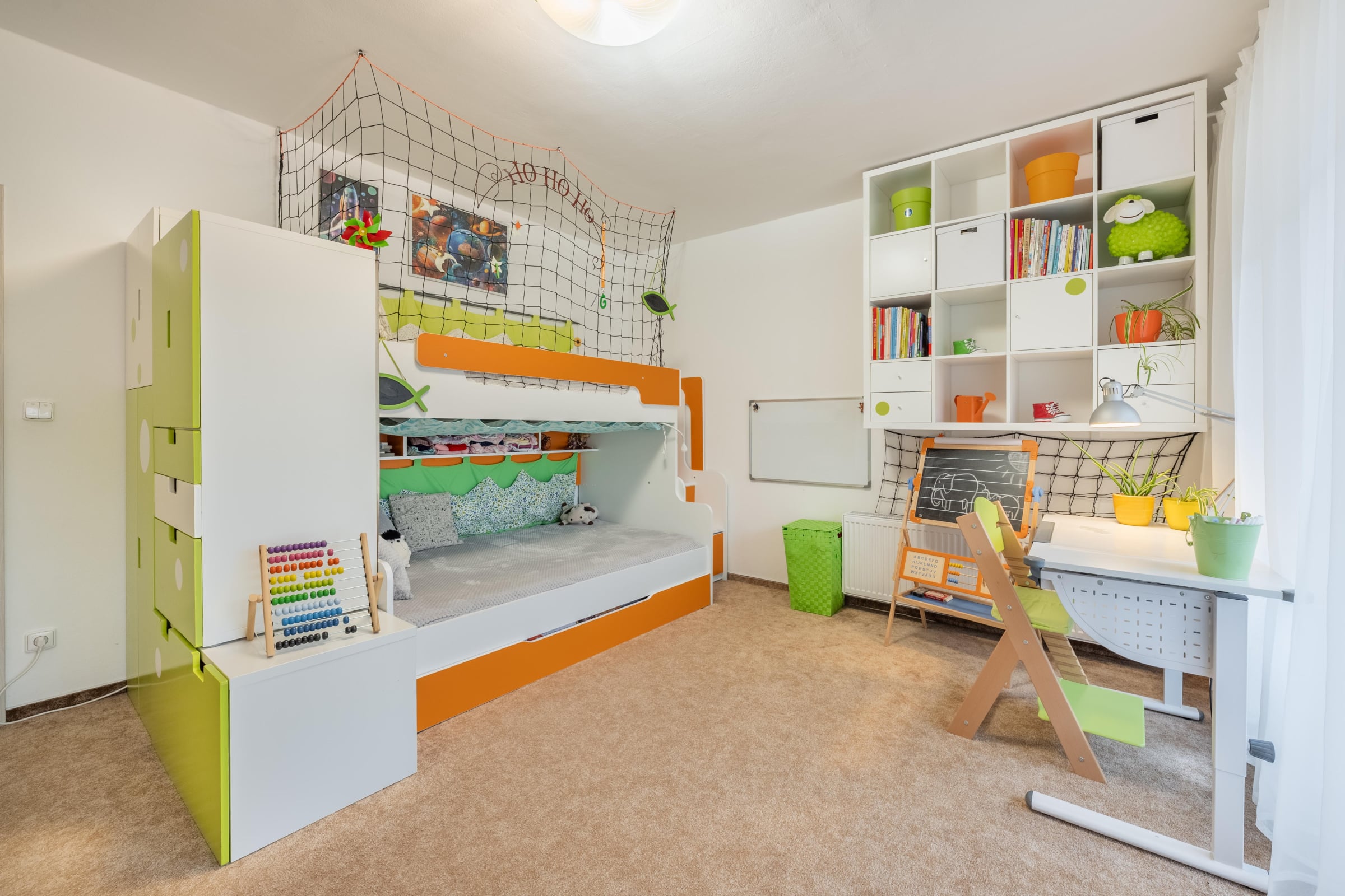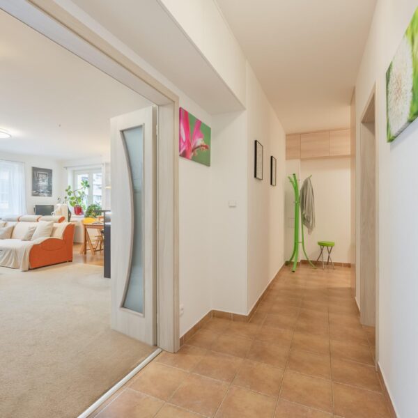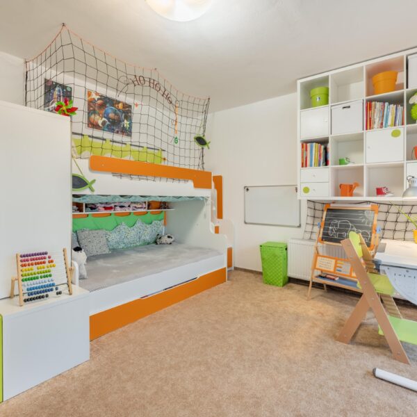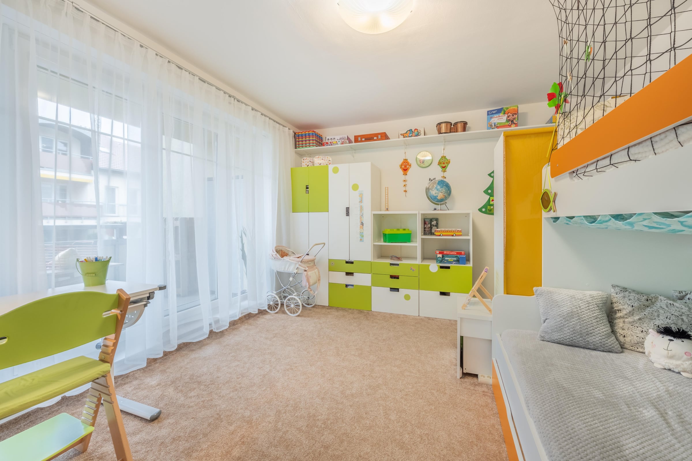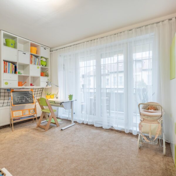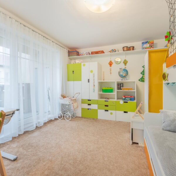 Jednotka je situována do 1. patra s výtahem, kdy pod bytem jsou garáže se zatepleným stropem. Okna mají orientaci na severovýchod a severozápad do zeleně a okolních domů. Byt je v perfektním stavu. Koupelna a záchod jsou po zdařilé rekonstrukci. Ložnice rodičů je aktuálně v nejmenším pokoji, kam se pohodlně vejde. Na prostorný dětský pokoj navazuje lodžie, o kterou je možno v teplých měsících pokoj v podstatě rozšířit. Obývací pokoj, kde je umístěn kuchyňský kout, je opravdu velkorysý – má plochu 38m2. V ložnici rodičů a předsíni jsou vestavěné skříně. V chodbě jsou i závěsné skříňky poskytující perfektní úložný prostor. Velikou výhodou tohoto bytu je zdařilá dispozice a solidní velikost i menšího pokoje, což u novostaveb není vždycky pravidlem.