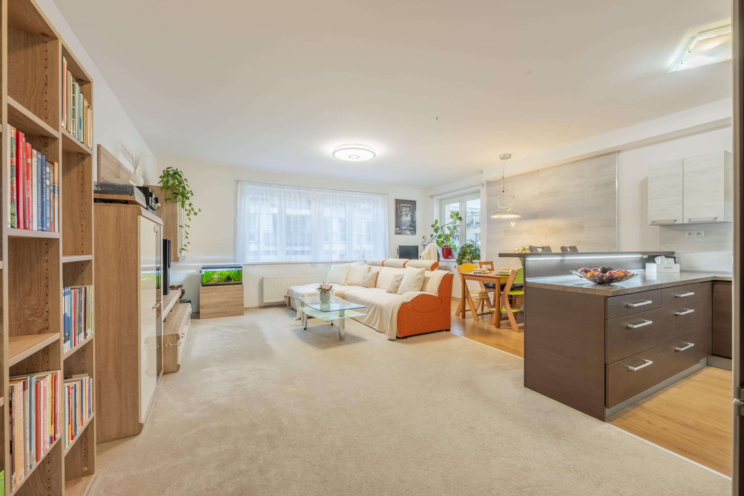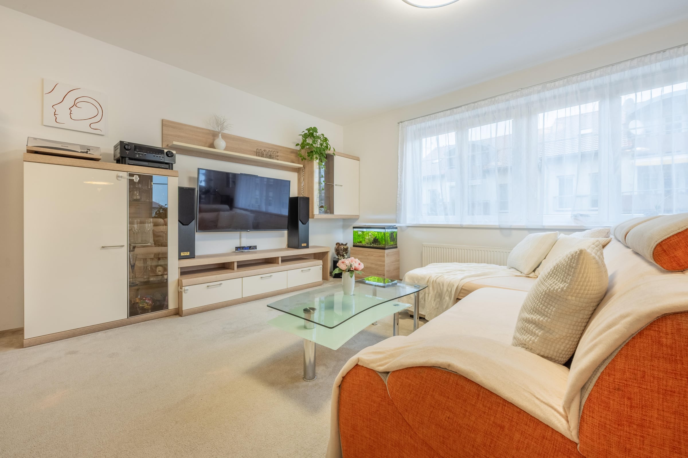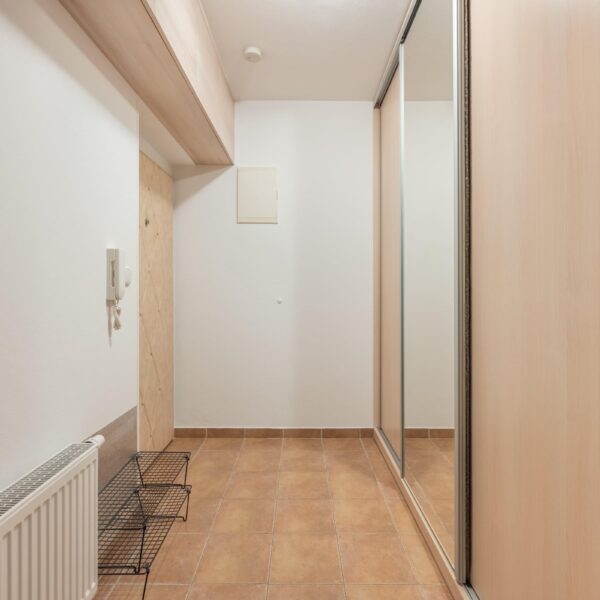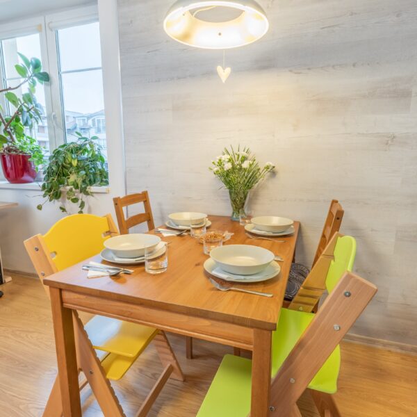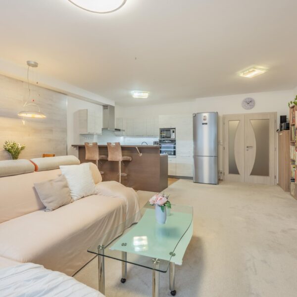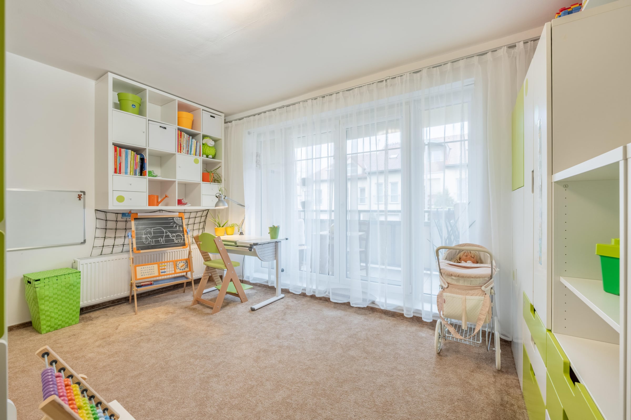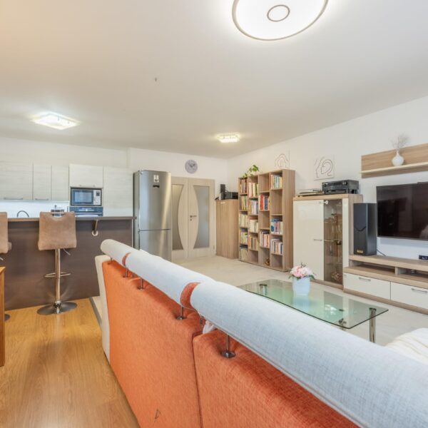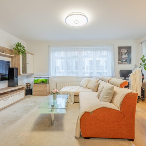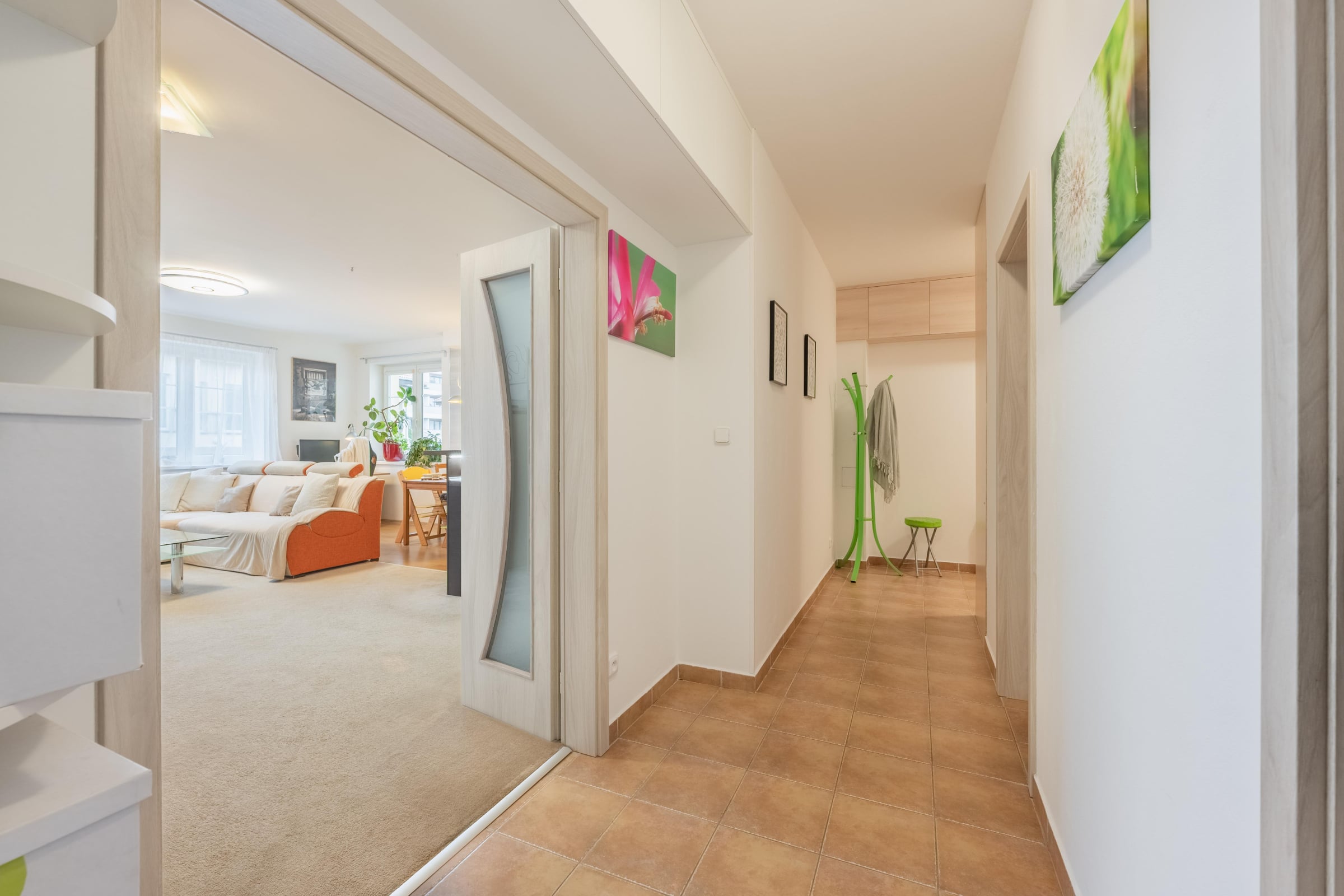 Jednotka je situována do 1. patra s výtahem, kdy pod bytem jsou garáže se zatepleným stropem. Okna mají orientaci na severovýchod a severozápad do zeleně a okolních domů. Byt je v perfektním stavu. Koupelna a záchod jsou po zdařilé rekonstrukci. Ložnice rodičů je aktuálně v nejmenším pokoji, kam se pohodlně vejde. Na prostorný dětský pokoj navazuje lodžie, o kterou je možno v teplých měsících pokoj v podstatě rozšířit. Obývací pokoj, kde je umístěn kuchyňský kout, je opravdu velkorysý – má plochu 38m2. V ložnici rodičů a předsíni jsou vestavěné skříně. V chodbě jsou i závěsné skříňky poskytující perfektní úložný prostor. Velikou výhodou tohoto bytu je zdařilá dispozice a solidní velikost i menšího pokoje, což u novostaveb není vždycky pravidlem.