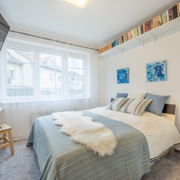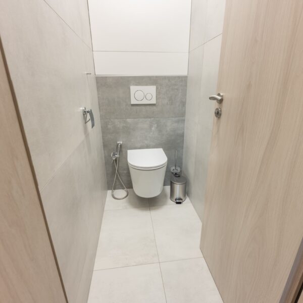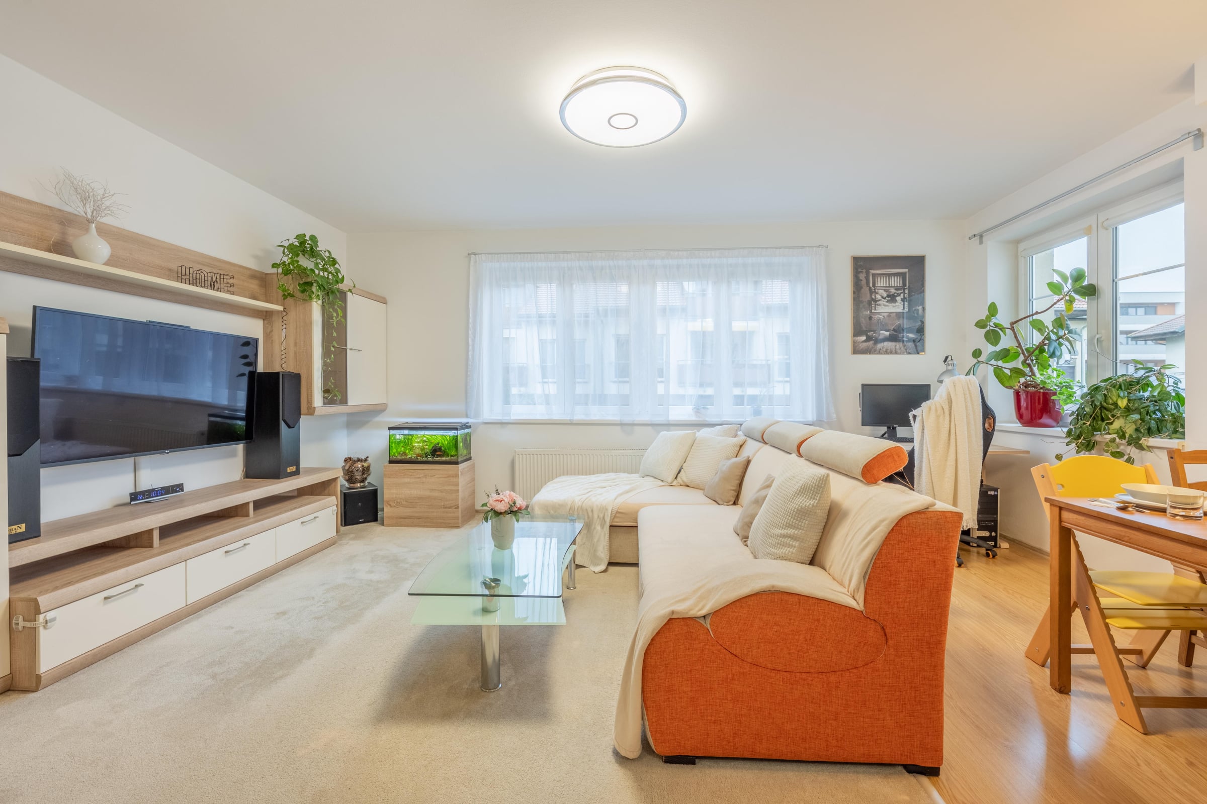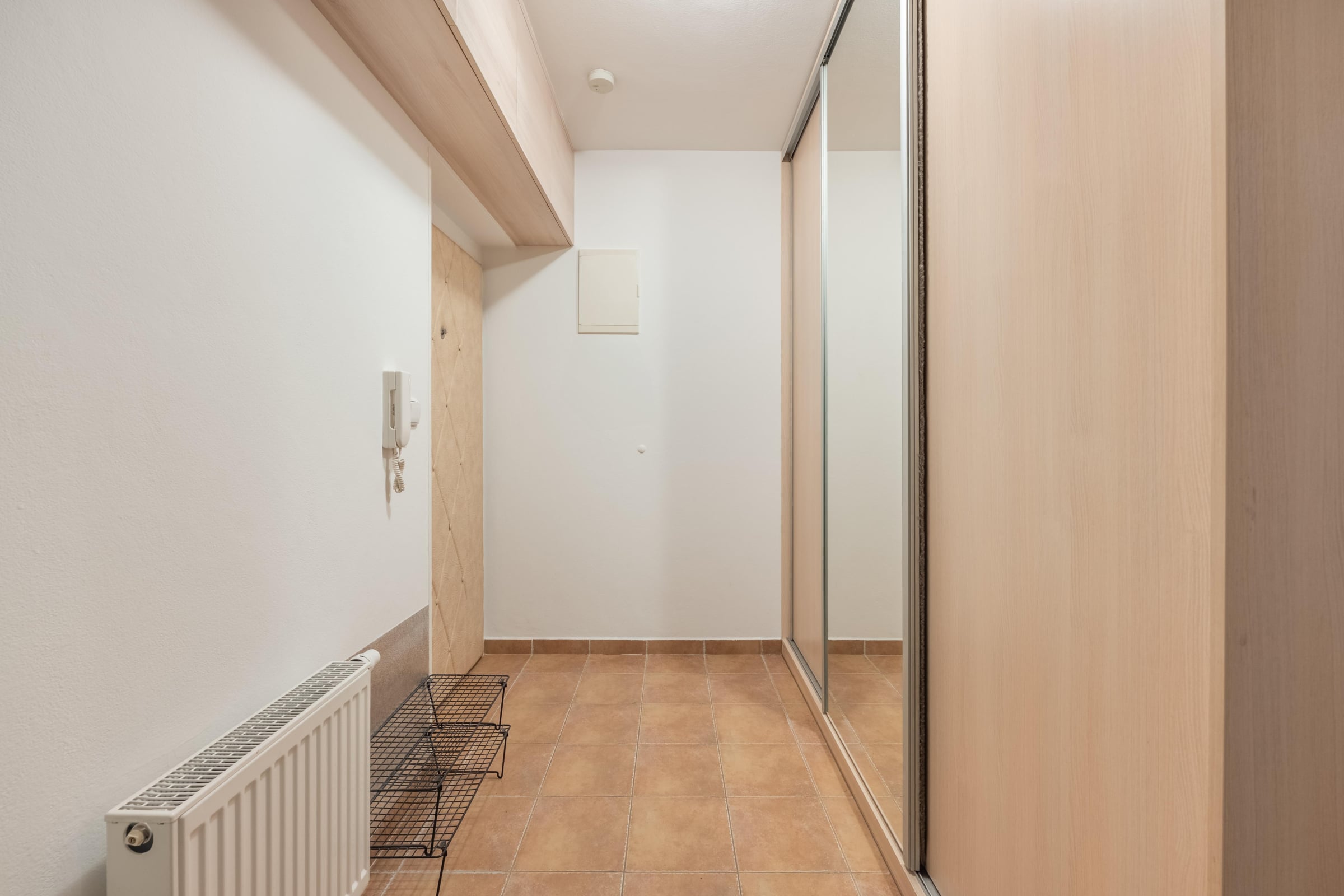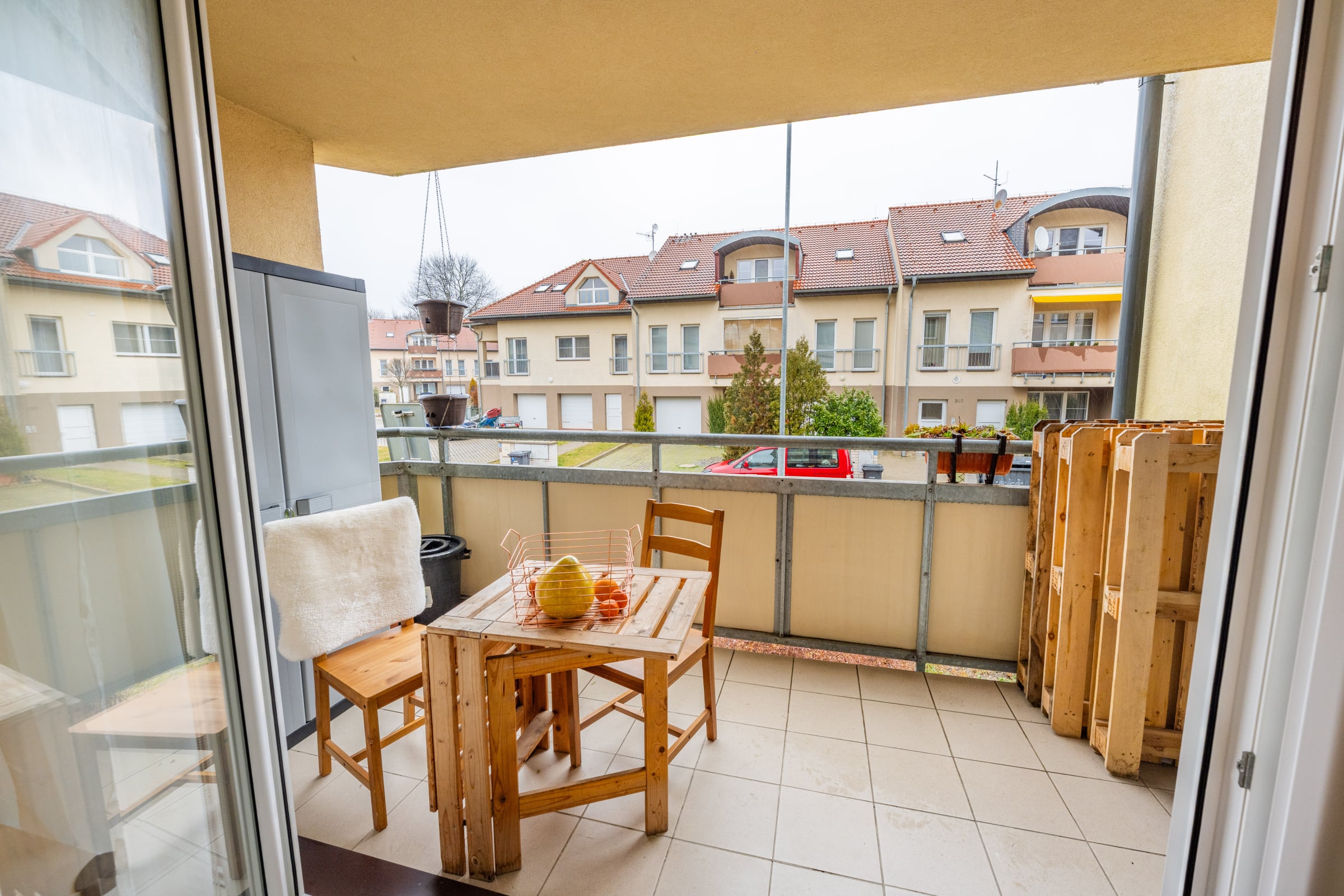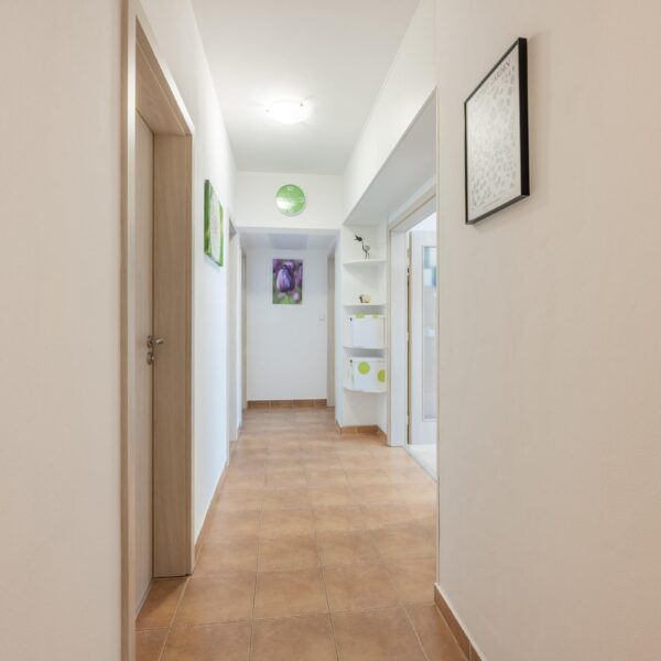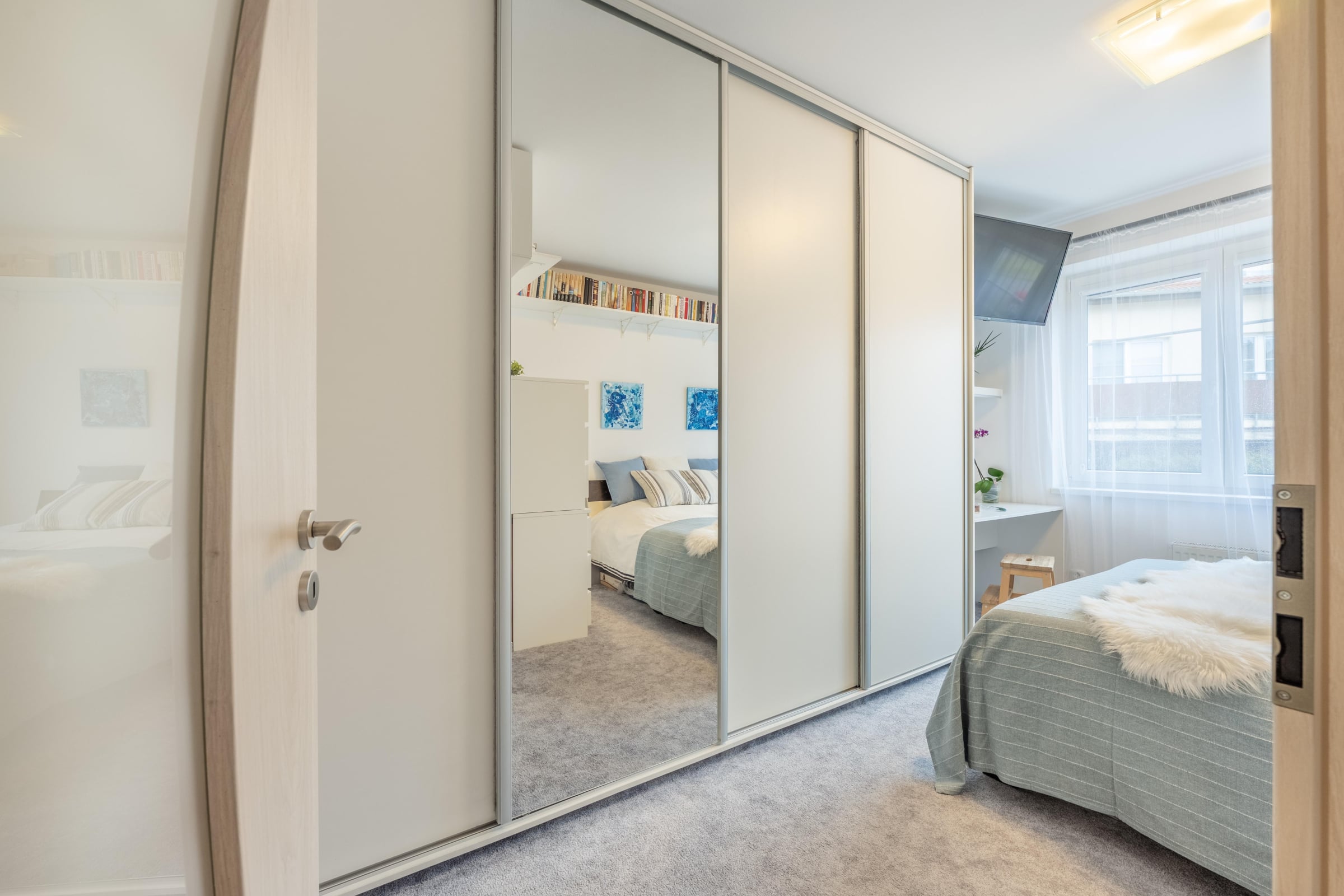 Jednotka je situována do 1. patra s výtahem, kdy pod bytem jsou garáže se zatepleným stropem. Okna mají orientaci na severovýchod a severozápad do zeleně a okolních domů. Byt je v perfektním stavu. Koupelna a záchod jsou po zdařilé rekonstrukci. Ložnice rodičů je aktuálně v nejmenším pokoji, kam se pohodlně vejde. Na prostorný dětský pokoj navazuje lodžie, o kterou je možno v teplých měsících pokoj v podstatě rozšířit. Obývací pokoj, kde je umístěn kuchyňský kout, je opravdu velkorysý – má plochu 38m2. V ložnici rodičů a předsíni jsou vestavěné skříně. V chodbě jsou i závěsné skříňky poskytující perfektní úložný prostor. Velikou výhodou tohoto bytu je zdařilá dispozice a solidní velikost i menšího pokoje, což u novostaveb není vždycky pravidlem.