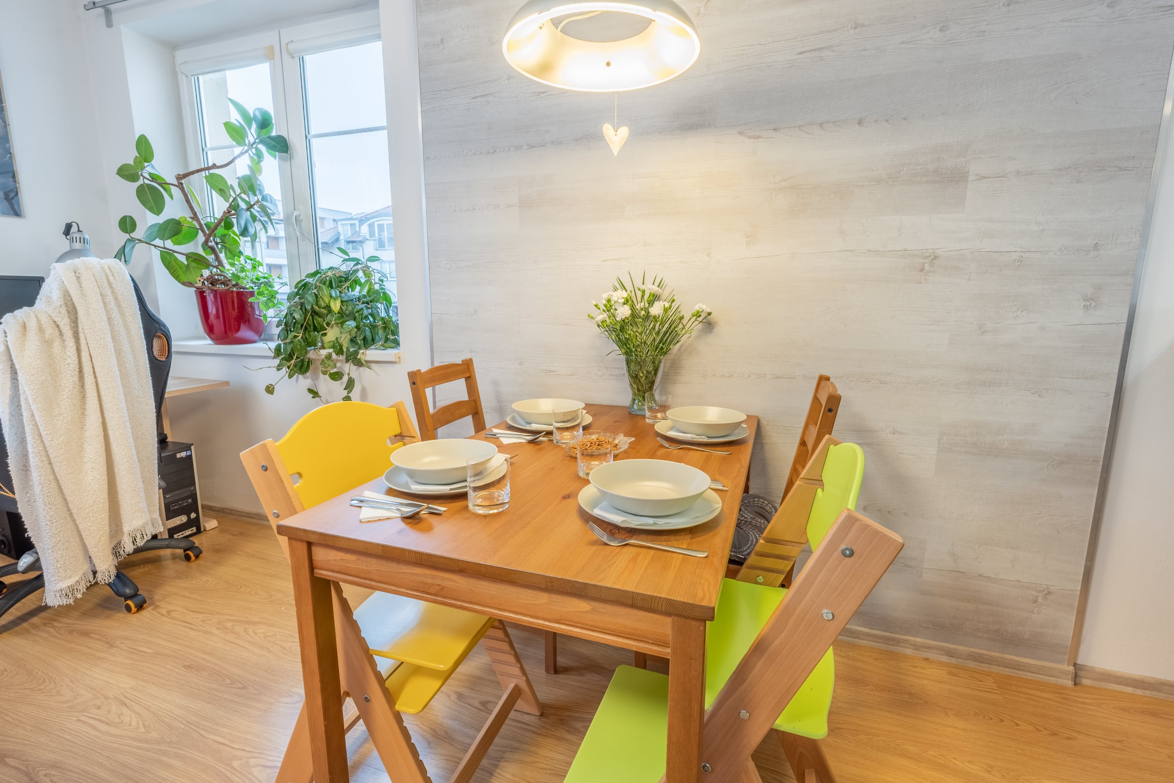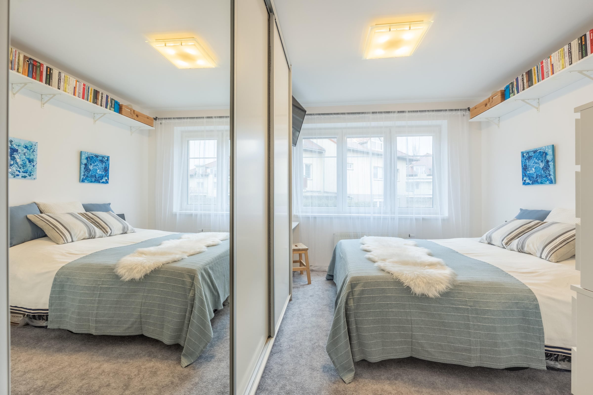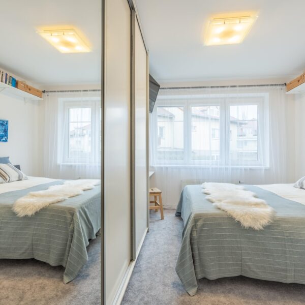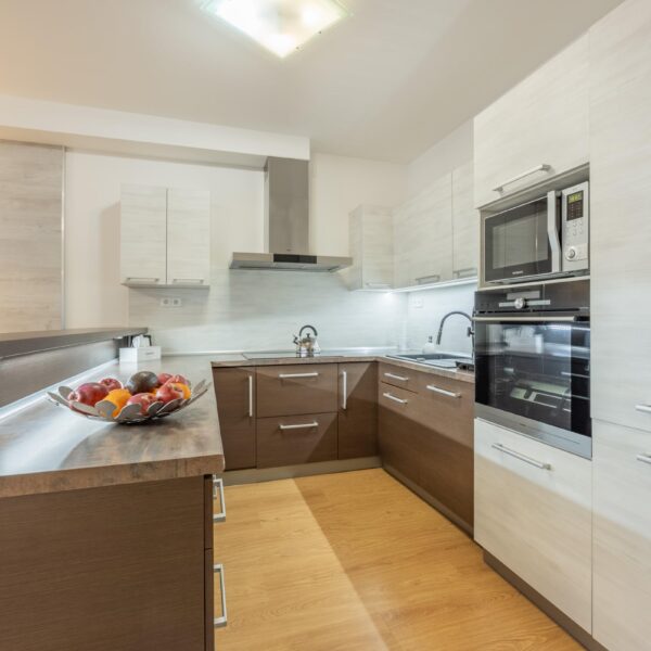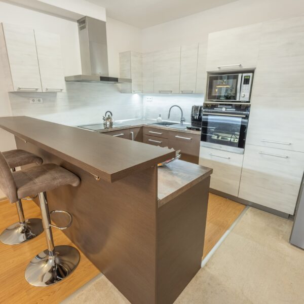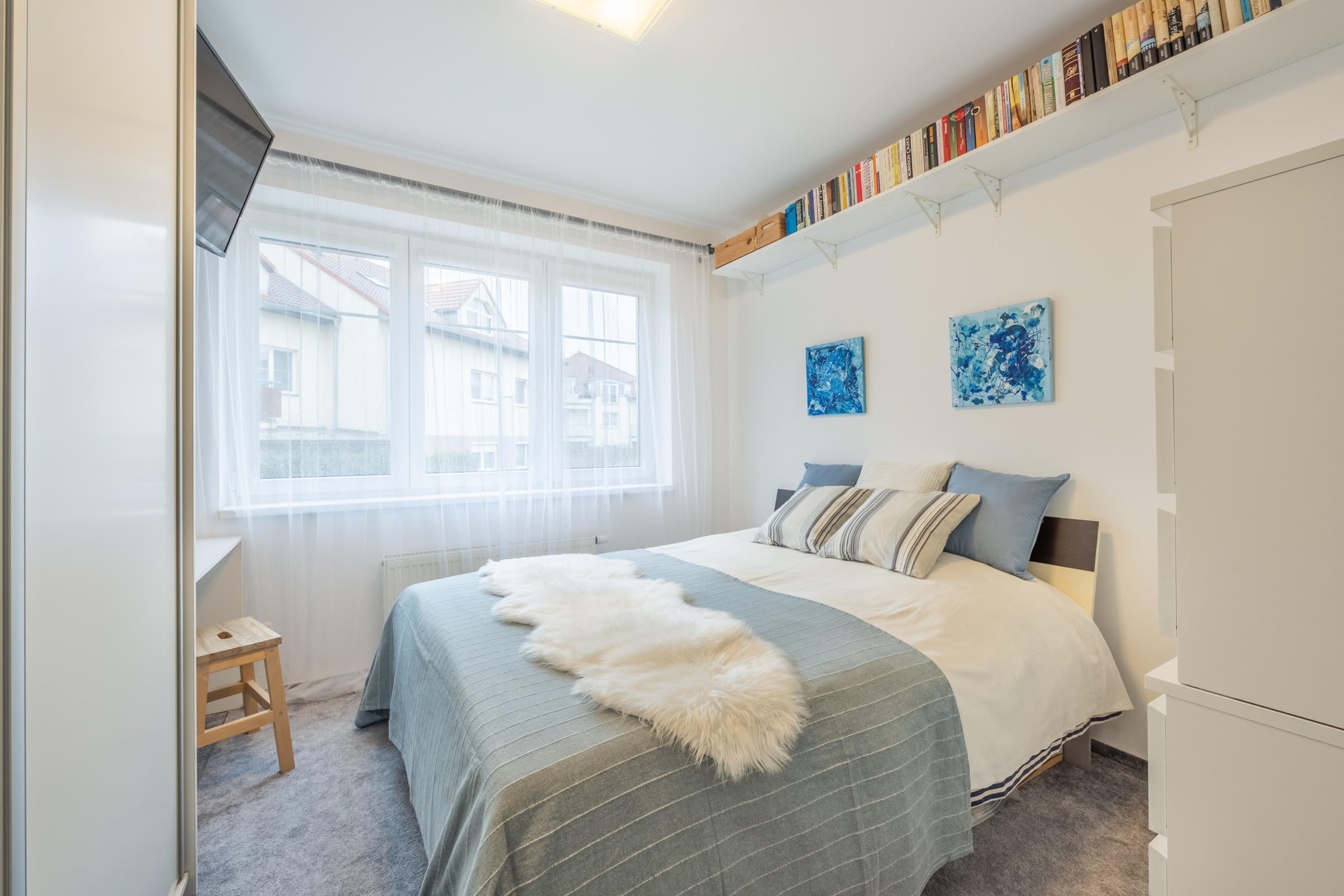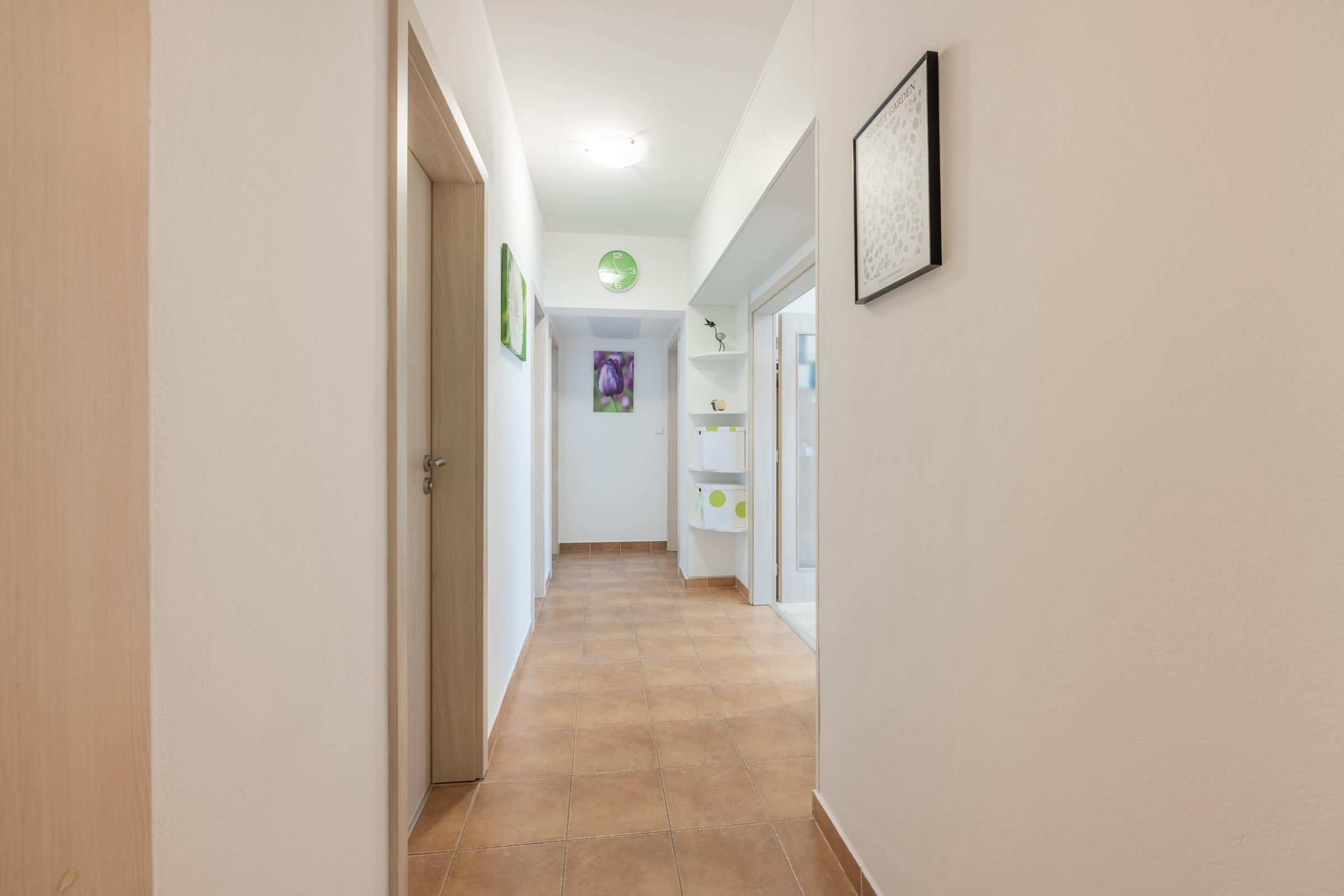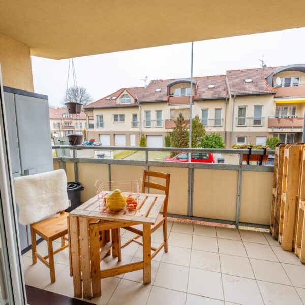 Jednotka je situována do 1. patra s výtahem, kdy pod bytem jsou garáže se zatepleným stropem. Okna mají orientaci na severovýchod a severozápad do zeleně a okolních domů. Byt je v perfektním stavu. Koupelna a záchod jsou po zdařilé rekonstrukci. Ložnice rodičů je aktuálně v nejmenším pokoji, kam se pohodlně vejde. Na prostorný dětský pokoj navazuje lodžie, o kterou je možno v teplých měsících pokoj v podstatě rozšířit. Obývací pokoj, kde je umístěn kuchyňský kout, je opravdu velkorysý – má plochu 38m2. V ložnici rodičů a předsíni jsou vestavěné skříně. V chodbě jsou i závěsné skříňky poskytující perfektní úložný prostor. Velikou výhodou tohoto bytu je zdařilá dispozice a solidní velikost i menšího pokoje, což u novostaveb není vždycky pravidlem.