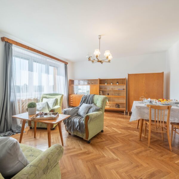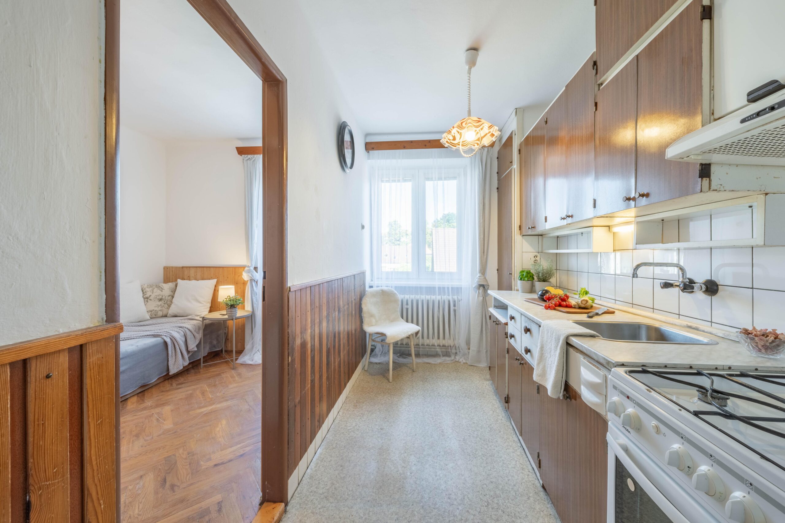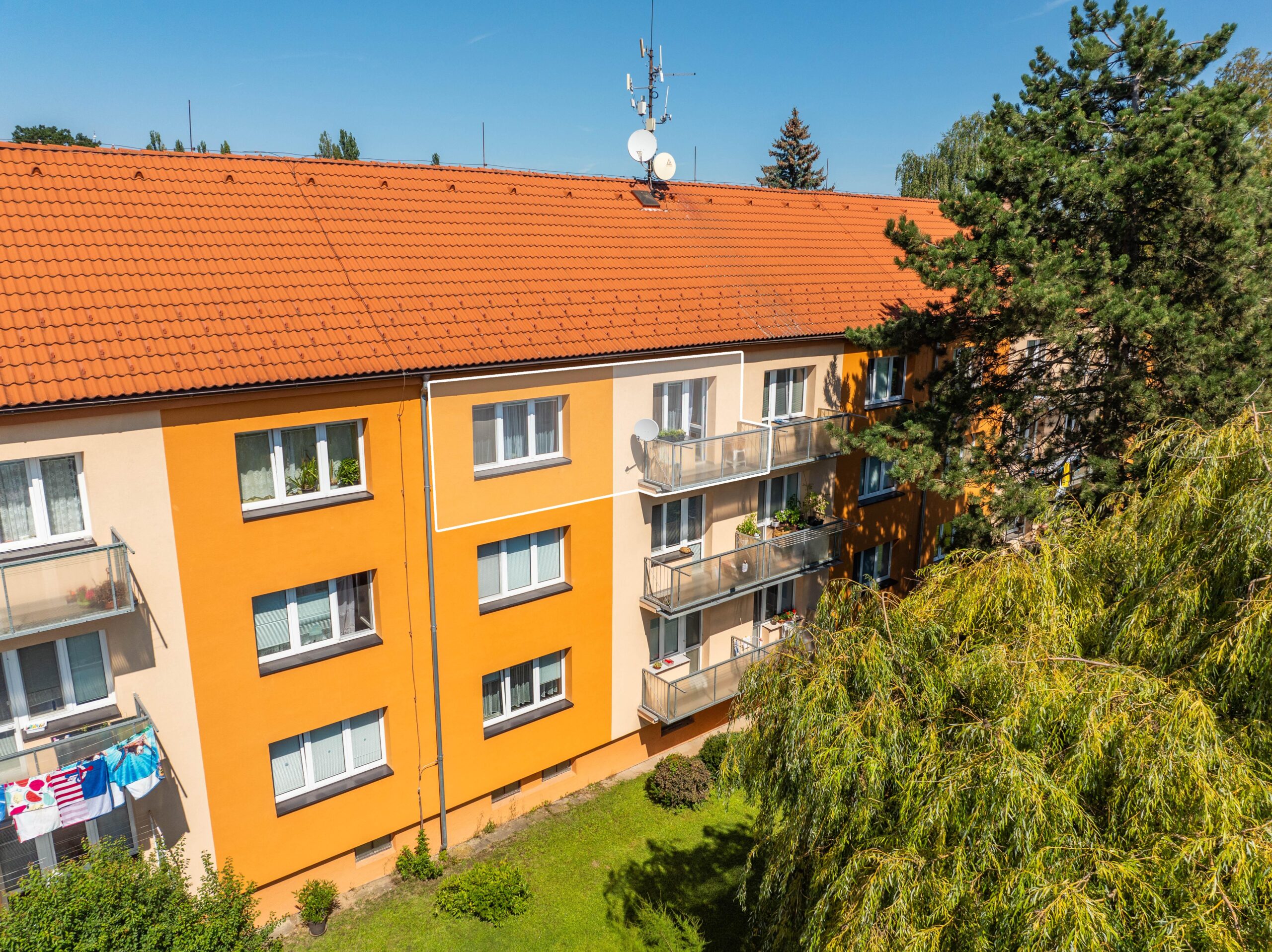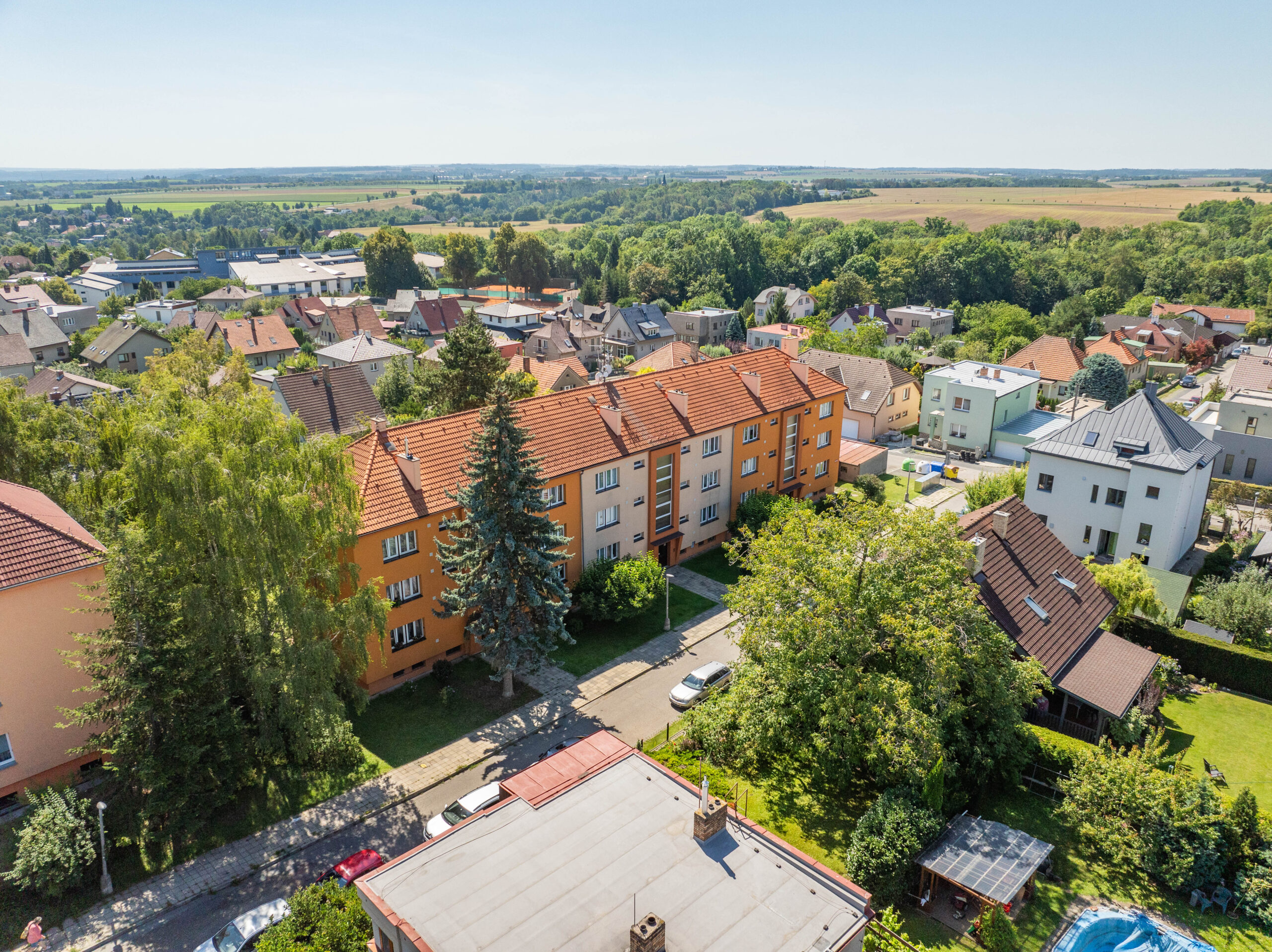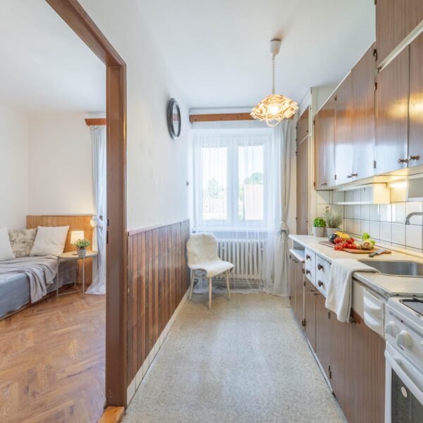 Jednotka je situována do 2. patra bez výtahu, kdy nad bytem jejiž jen půda. Okna mají orientaci na jihovýchod a severozápad do zeleně a okolních rodiných domů. Byt je v původním udržovaném stavu s novým kotlem Bosch. Ložnice, obývací i dětský pokoj mají na podlahách velmi pěkné a nevrzající parkety. V chodbě a koupelně je dlažba a v kuchyni původní PVC. V předsíni je vestavěná skřínka. V ložnici jsou původní vestavěné skříně přes celou stěnu a poskytují opravdu úžasné množství prostoru. Čistá podlahová plocha bytu činí 62m2 (plus cca 9m2 sklep a 2,3m2 balkón).