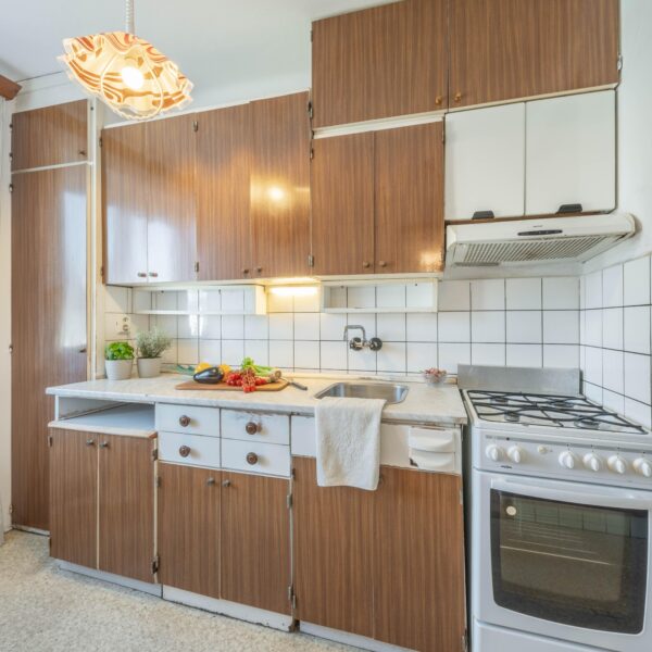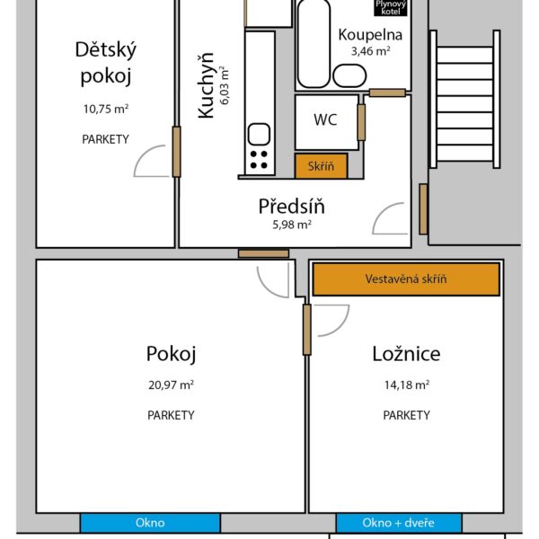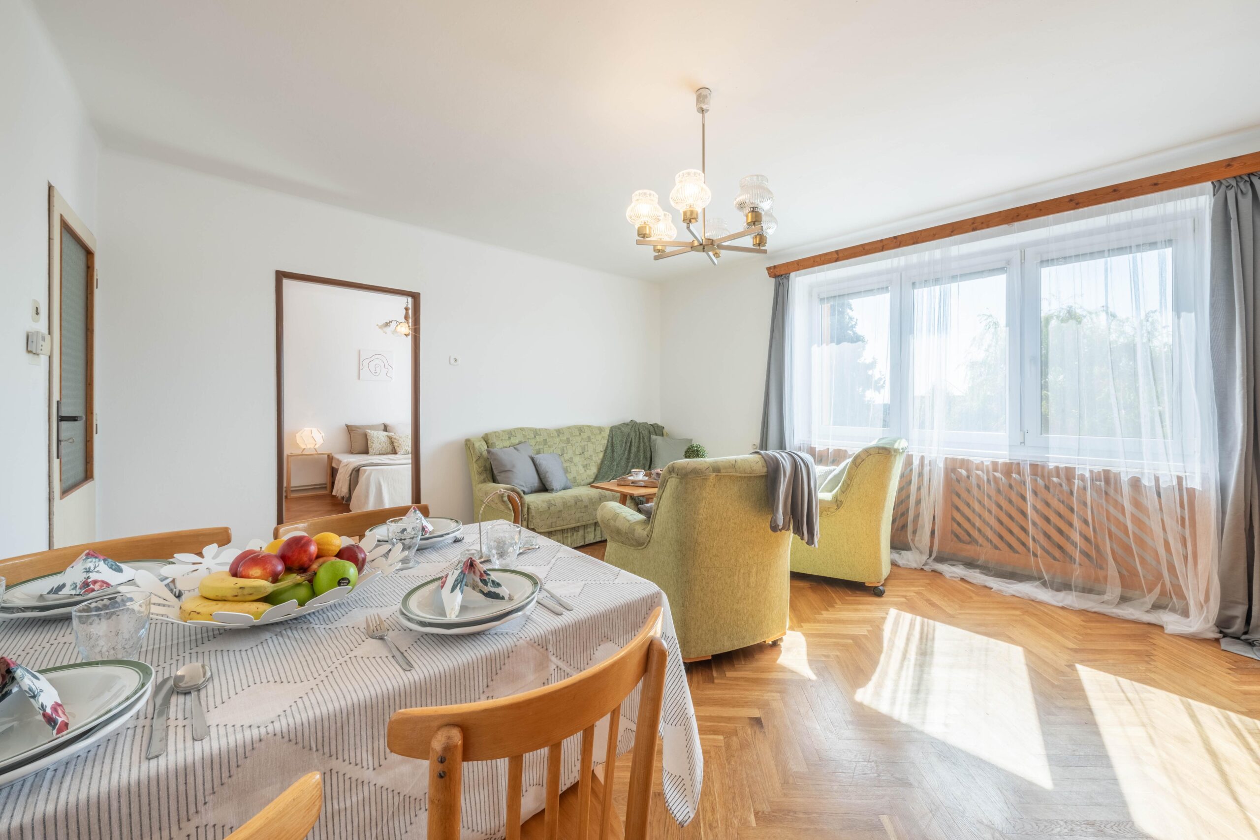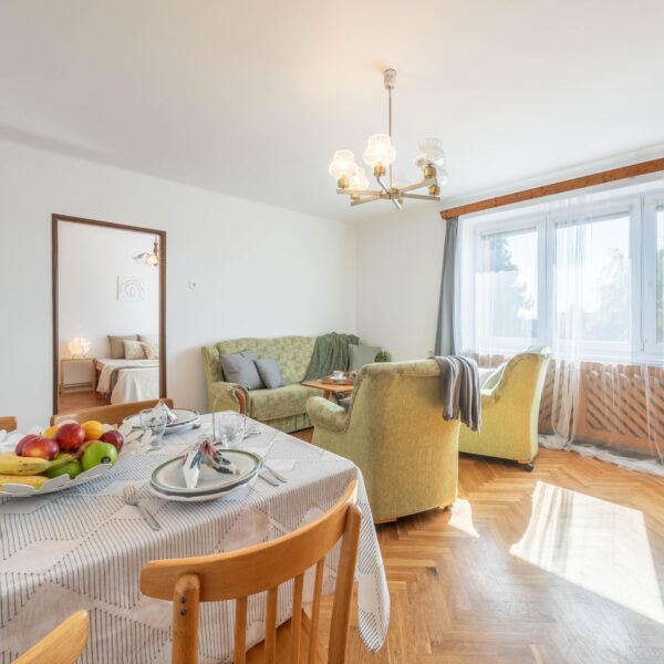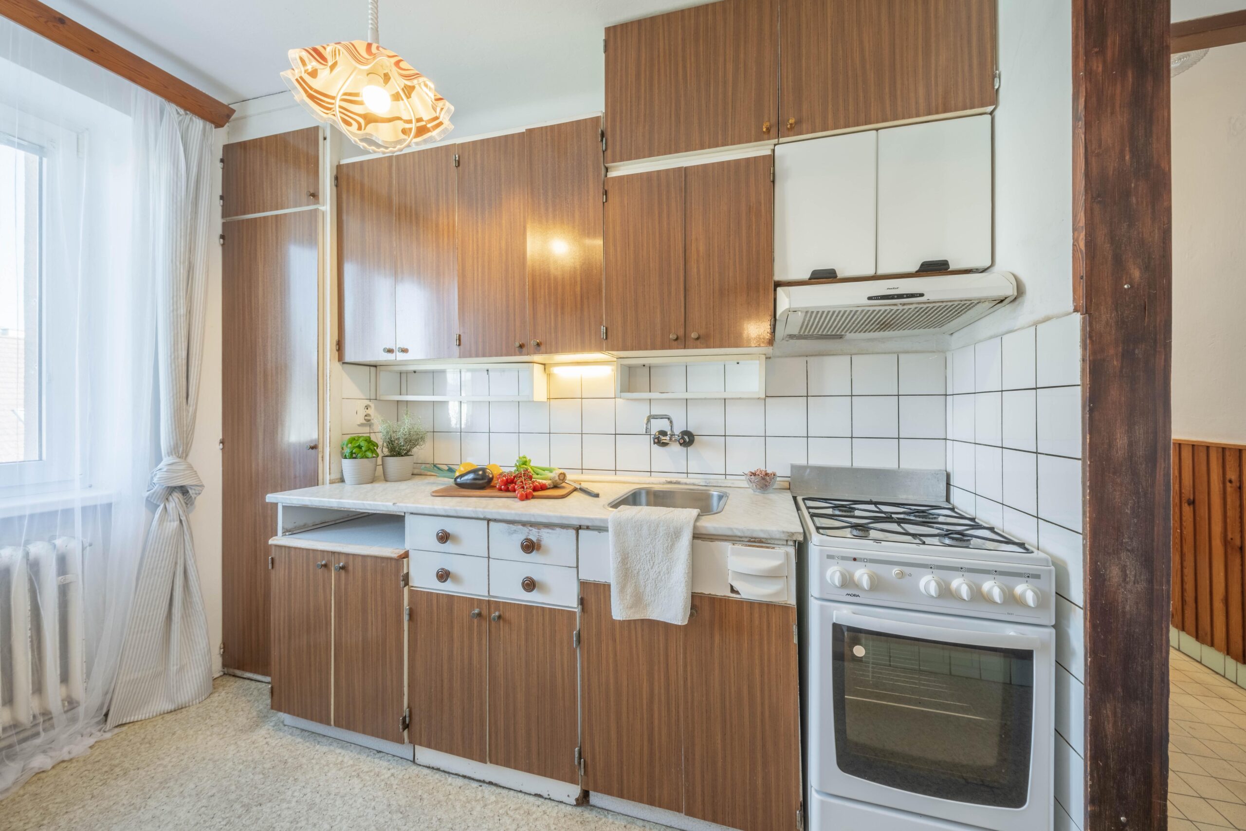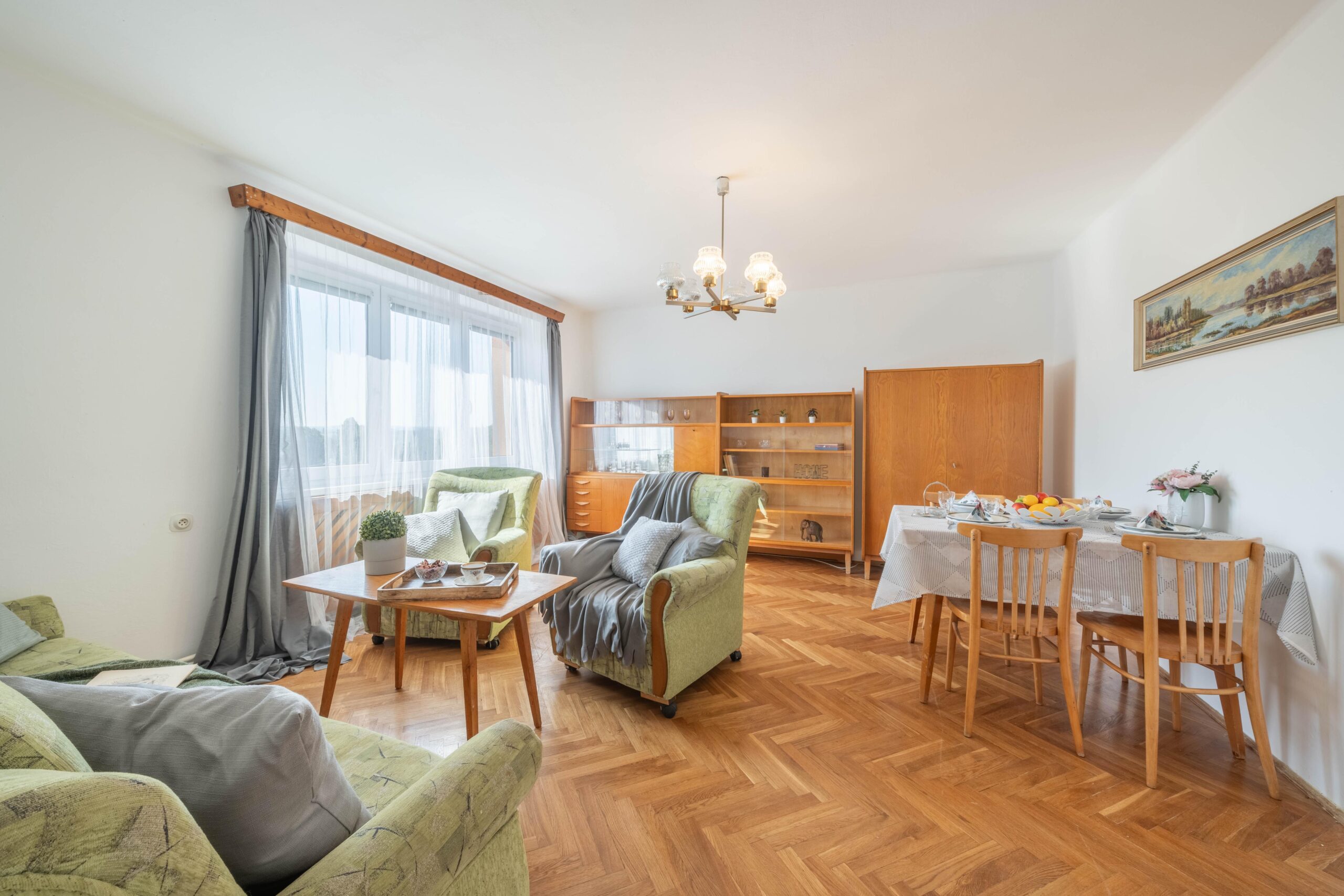 Jednotka je situována do 2. patra bez výtahu, kdy nad bytem jejiž jen půda. Okna mají orientaci na jihovýchod a severozápad do zeleně a okolních rodiných domů. Byt je v původním udržovaném stavu s novým kotlem Bosch. Ložnice, obývací i dětský pokoj mají na podlahách velmi pěkné a nevrzající parkety. V chodbě a koupelně je dlažba a v kuchyni původní PVC. V předsíni je vestavěná skřínka. V ložnici jsou původní vestavěné skříně přes celou stěnu a poskytují opravdu úžasné množství prostoru. Čistá podlahová plocha bytu činí 62m2 (plus cca 9m2 sklep a 2,3m2 balkón).