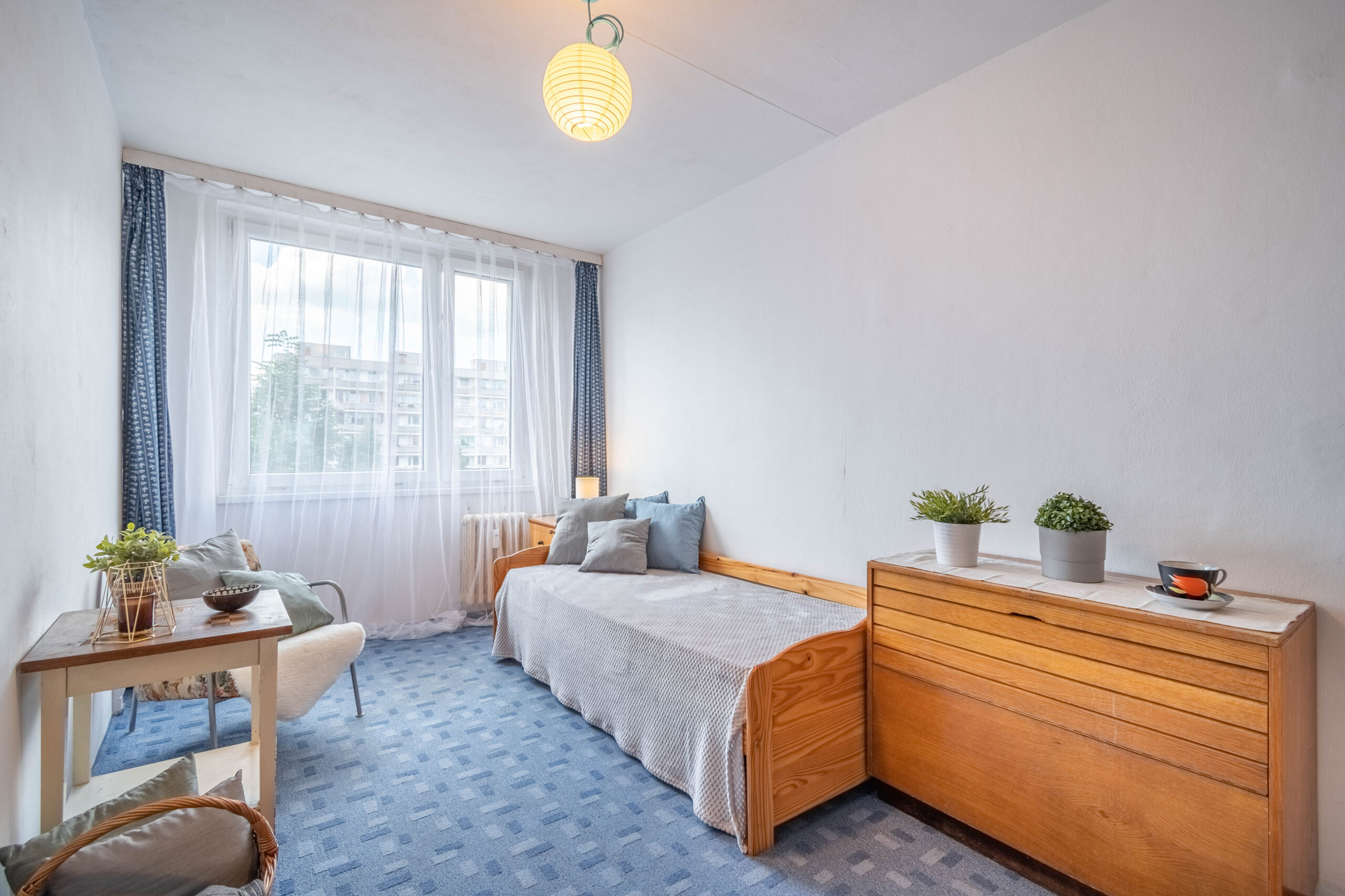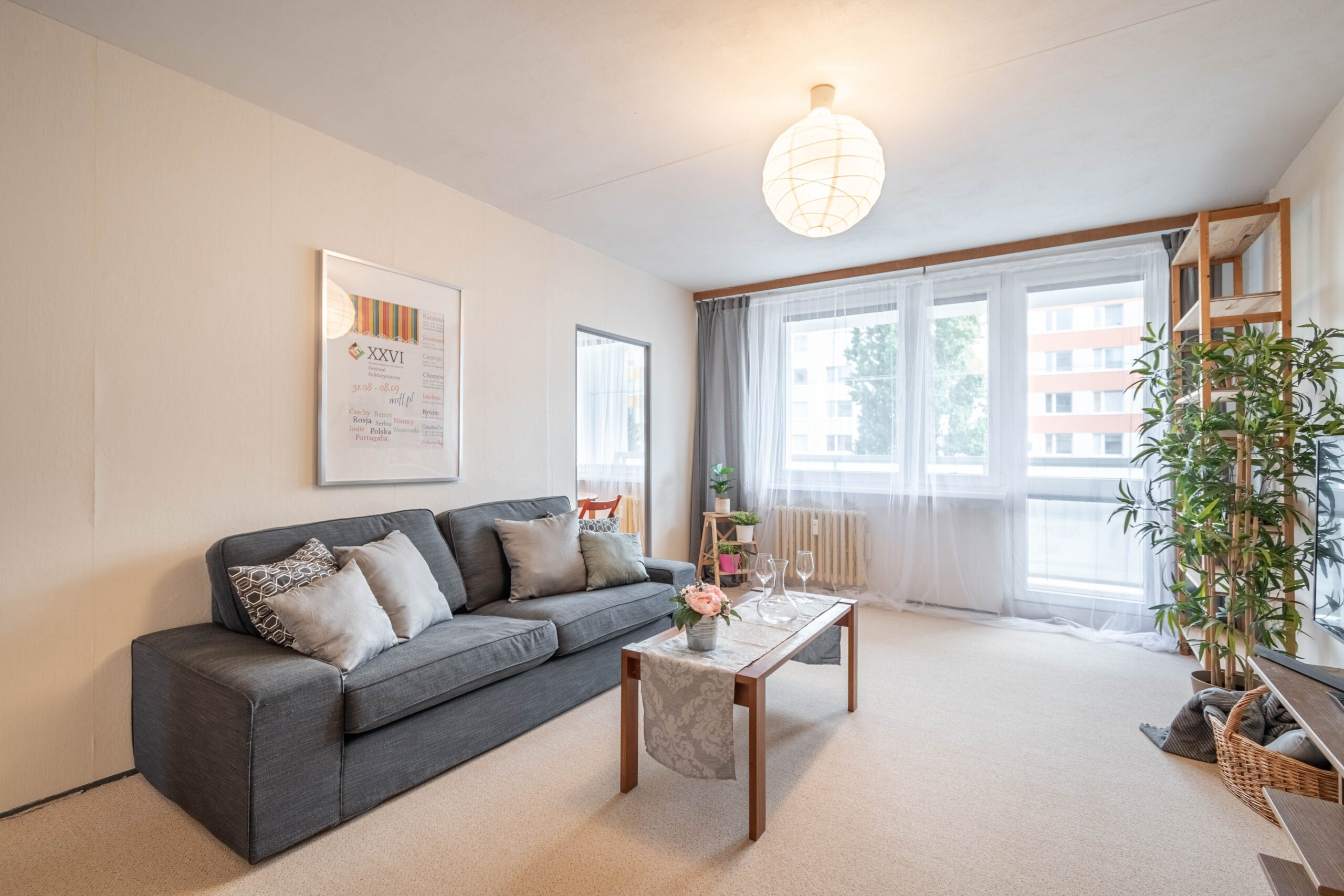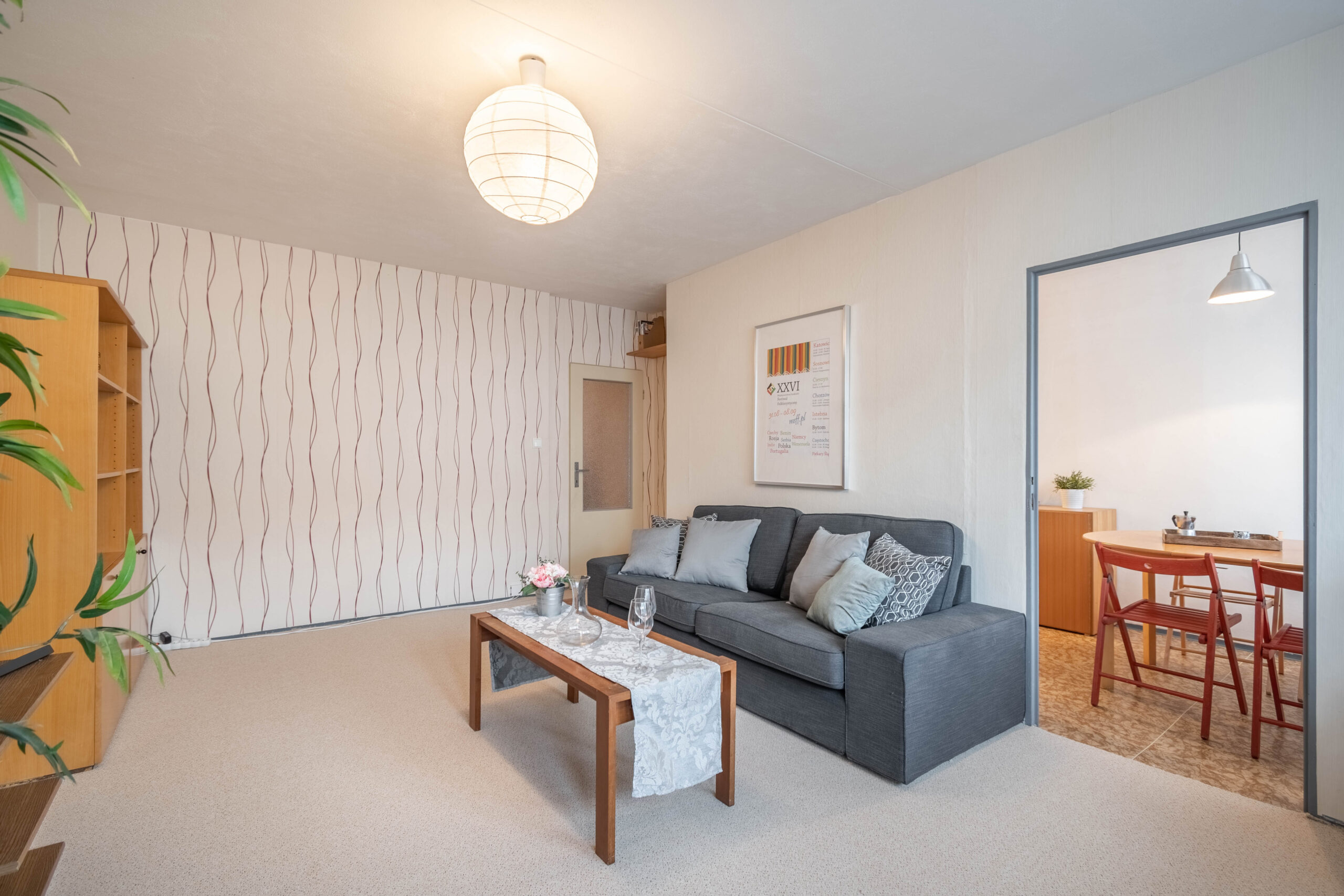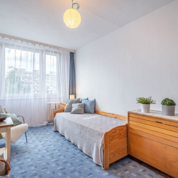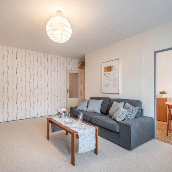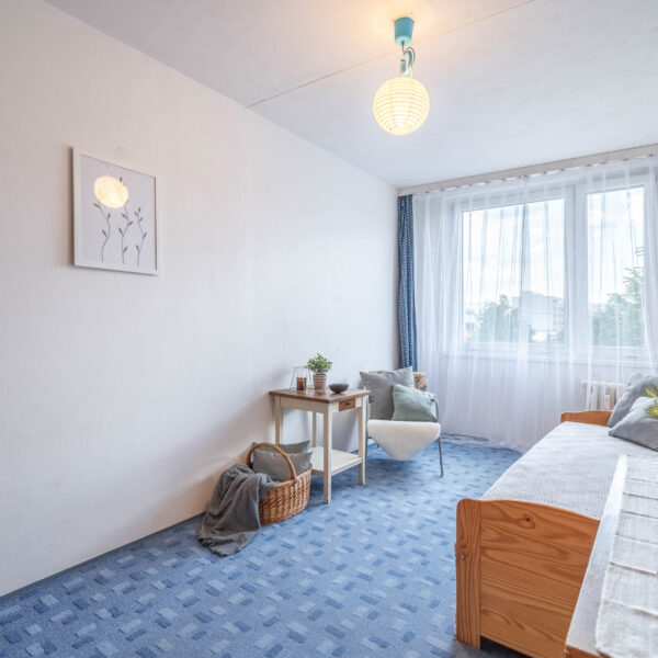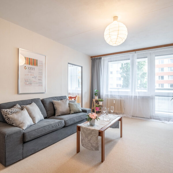 Byt se nachází ve 4.patře a nabízí dostatek prostoru i soukromí – na každém patře jsou pouze dva byty. Celková plocha 83,5m2 zahrnuje 73m2 vnitřní plochy, 7m2 lodžie a 3,5m2 sklep. V bytě je zděné jádro a v koupelně rohová vana (wc zvlášť, také zděné). Na sever do vnitrobloku orientované dva pokoje a na jih samostatná kuchyň a obývací pokoj, na které navazuje velkorysá lodžie. Předsíň a chodba poskytují dostatek místa i na úložné prostory (je zde krásná šatna i místo na skříně) a ještě se v ní obujete ve čtyřech lidech. Kuchyň je původní a poskytne tak možnost dotvoření interiéru podle vkusu nových majitelů.