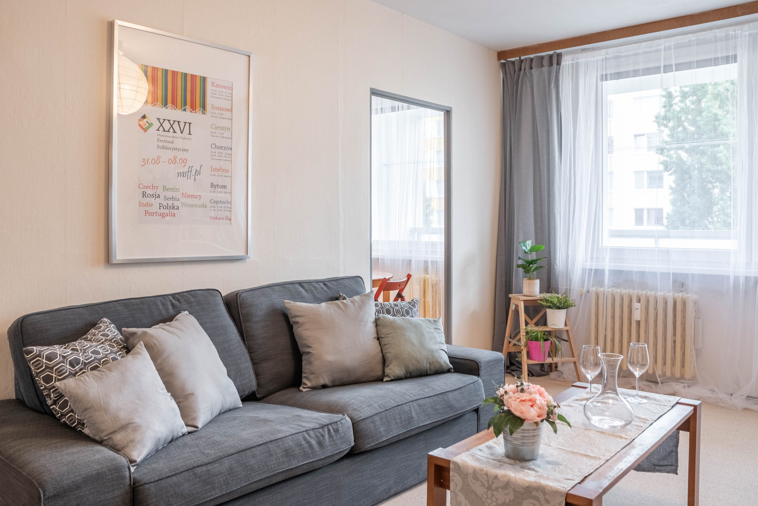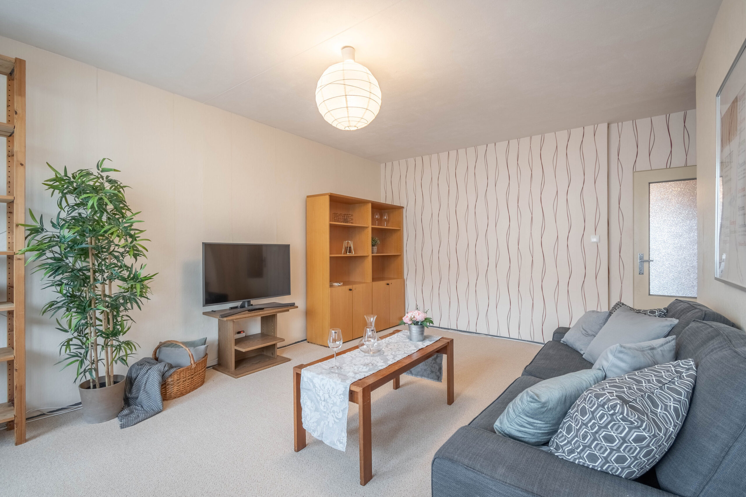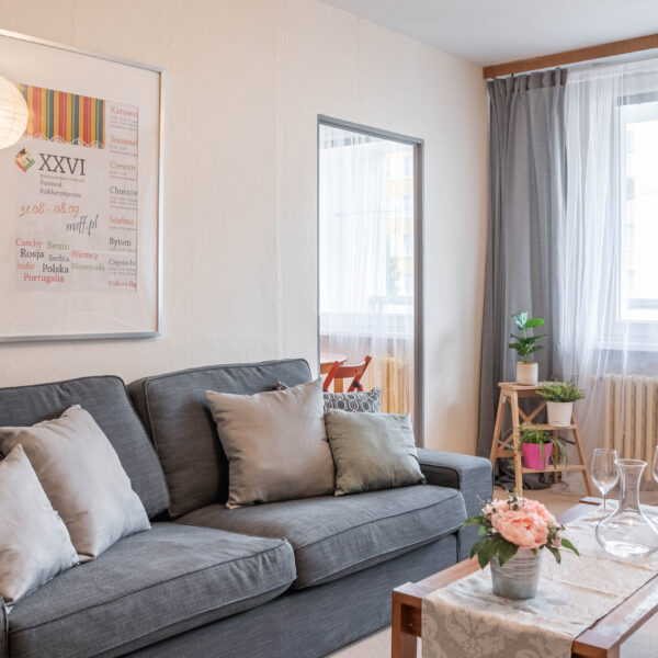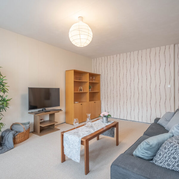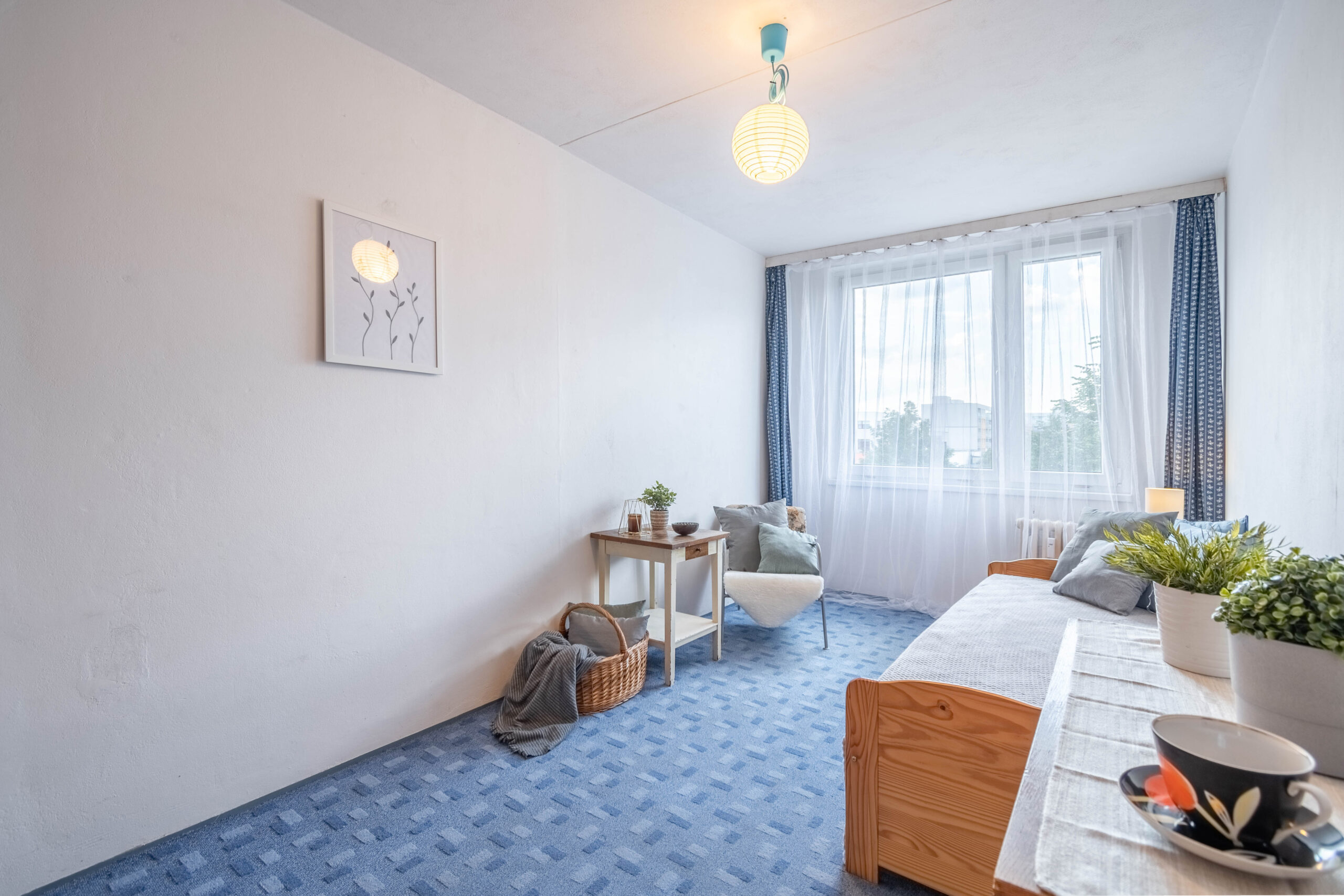 Byt se nachází ve 4.patře a nabízí dostatek prostoru i soukromí – na každém patře jsou pouze dva byty. Celková plocha 83,5m2 zahrnuje 73m2 vnitřní plochy, 7m2 lodžie a 3,5m2 sklep. V bytě je zděné jádro a v koupelně rohová vana (wc zvlášť, také zděné). Na sever do vnitrobloku orientované dva pokoje a na jih samostatná kuchyň a obývací pokoj, na které navazuje velkorysá lodžie. Předsíň a chodba poskytují dostatek místa i na úložné prostory (je zde krásná šatna i místo na skříně) a ještě se v ní obujete ve čtyřech lidech. Kuchyň je původní a poskytne tak možnost dotvoření interiéru podle vkusu nových majitelů.