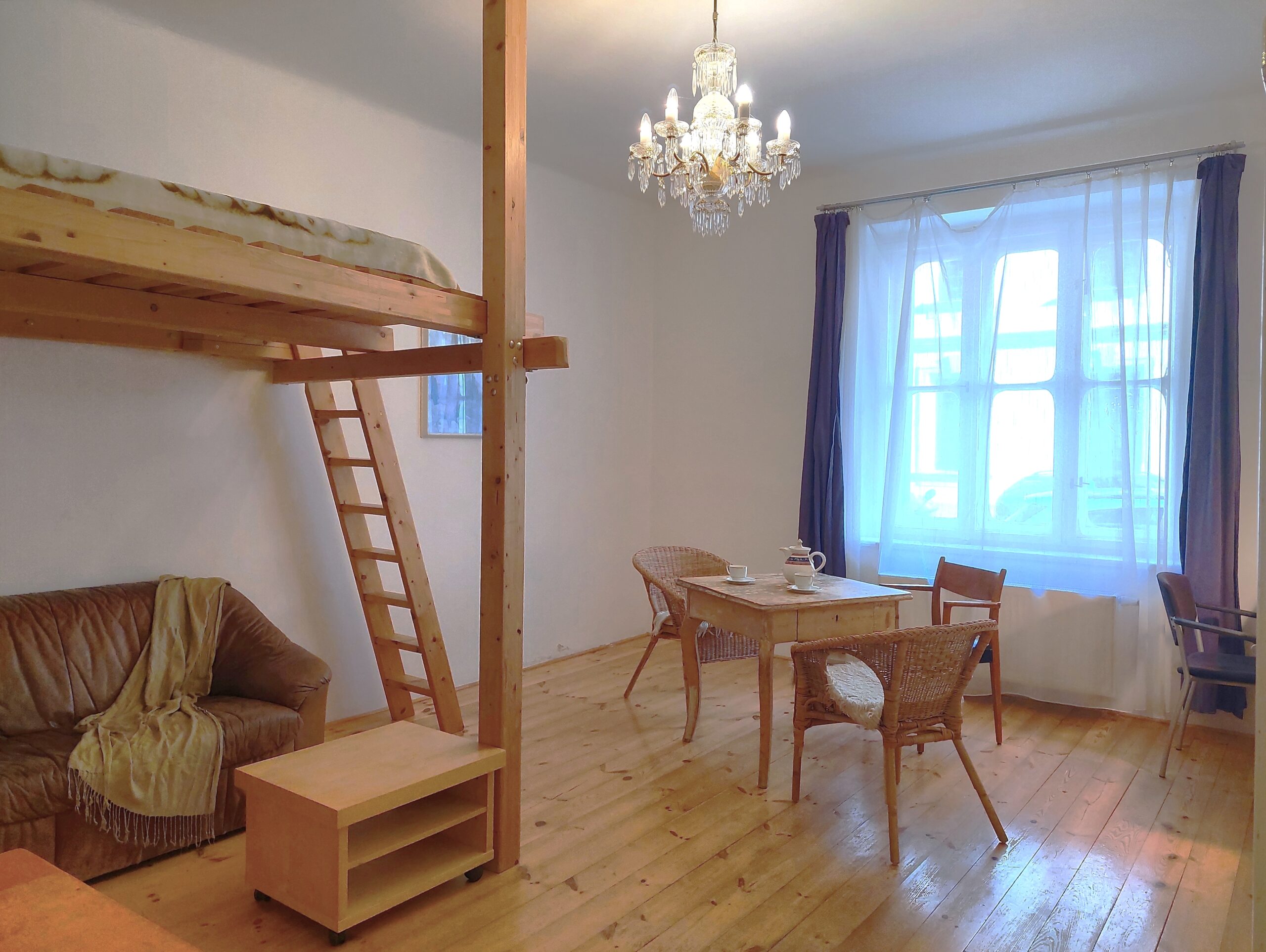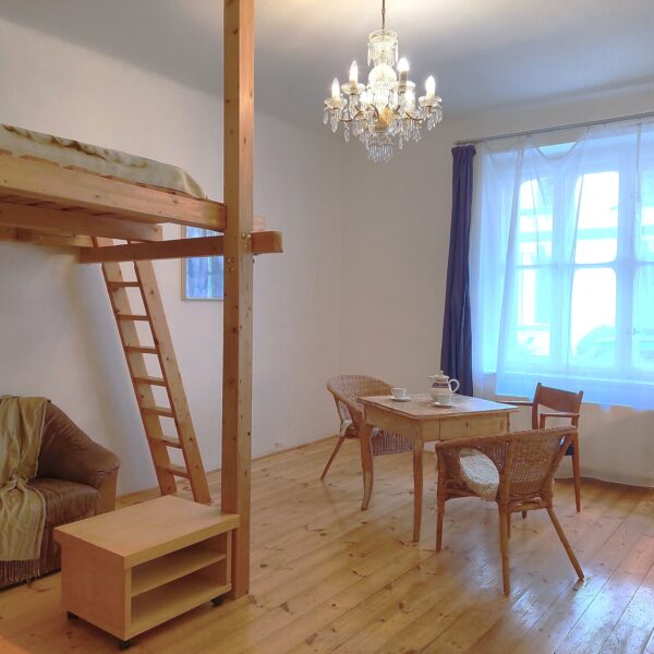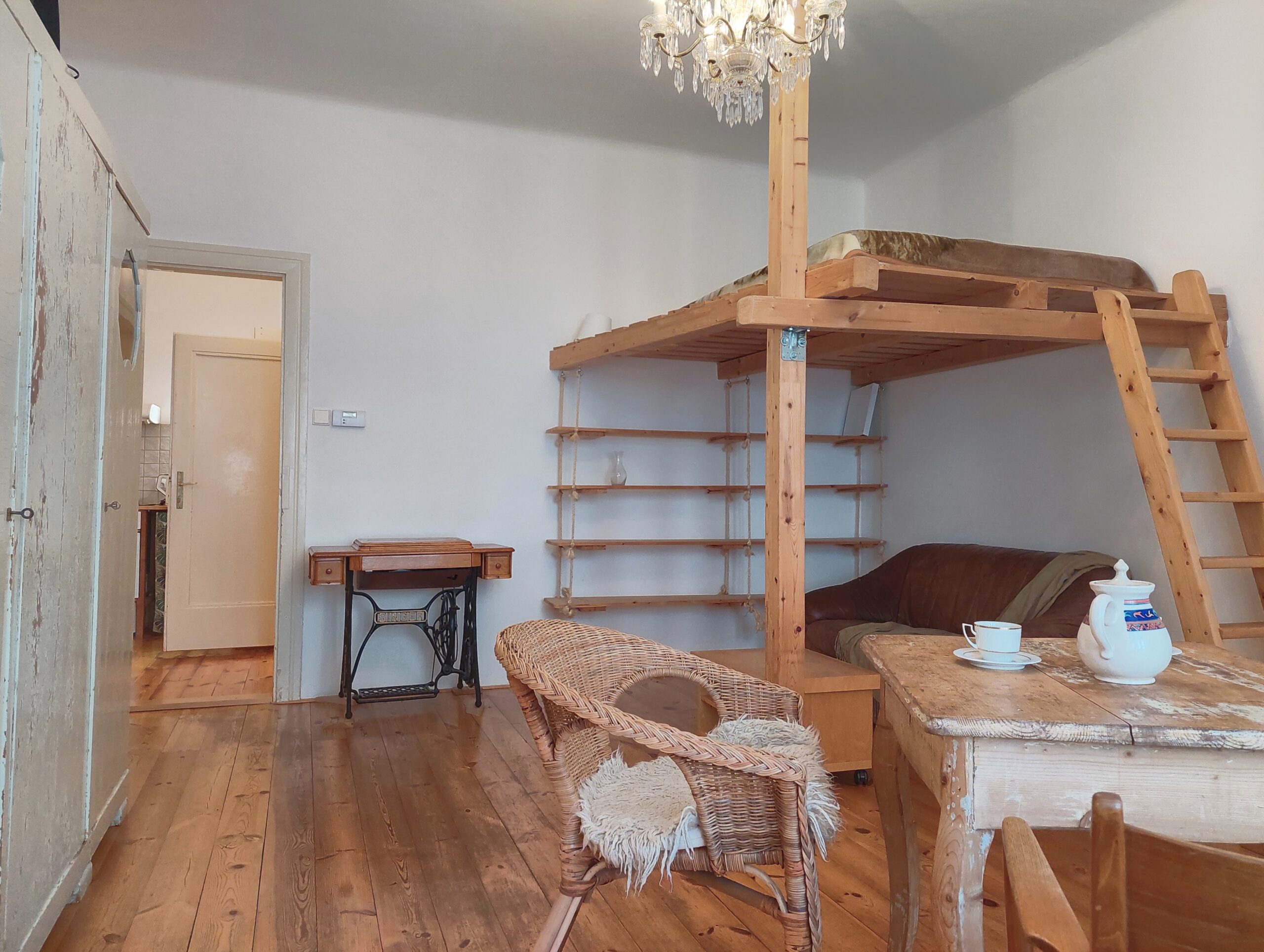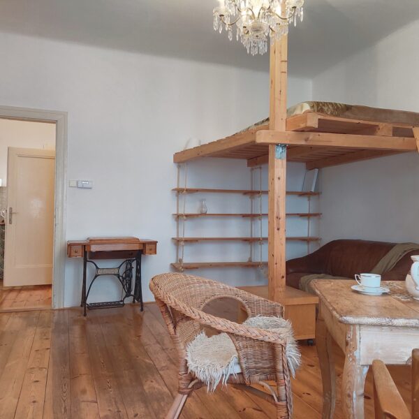Nabízím Vám byt 2+1 téměř na rohu ulice Přístavní a Komunardů. Byt se skládá ze dvou neprůchozích velkých pokojů a menší kuchyně s barovým sezením. Koupelna společná s wc (i pračka). Vlastní plynový kotel, dřevěná podlaha, byt zařízen retro nábytkem co je na fotkách – ve stylu shabby chic. Přízemí, okna do vedlejší ulice. Pro maximálně dvě osoby.