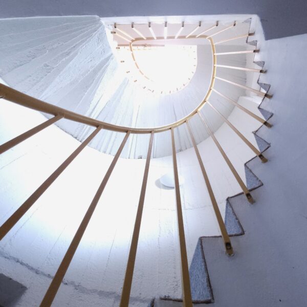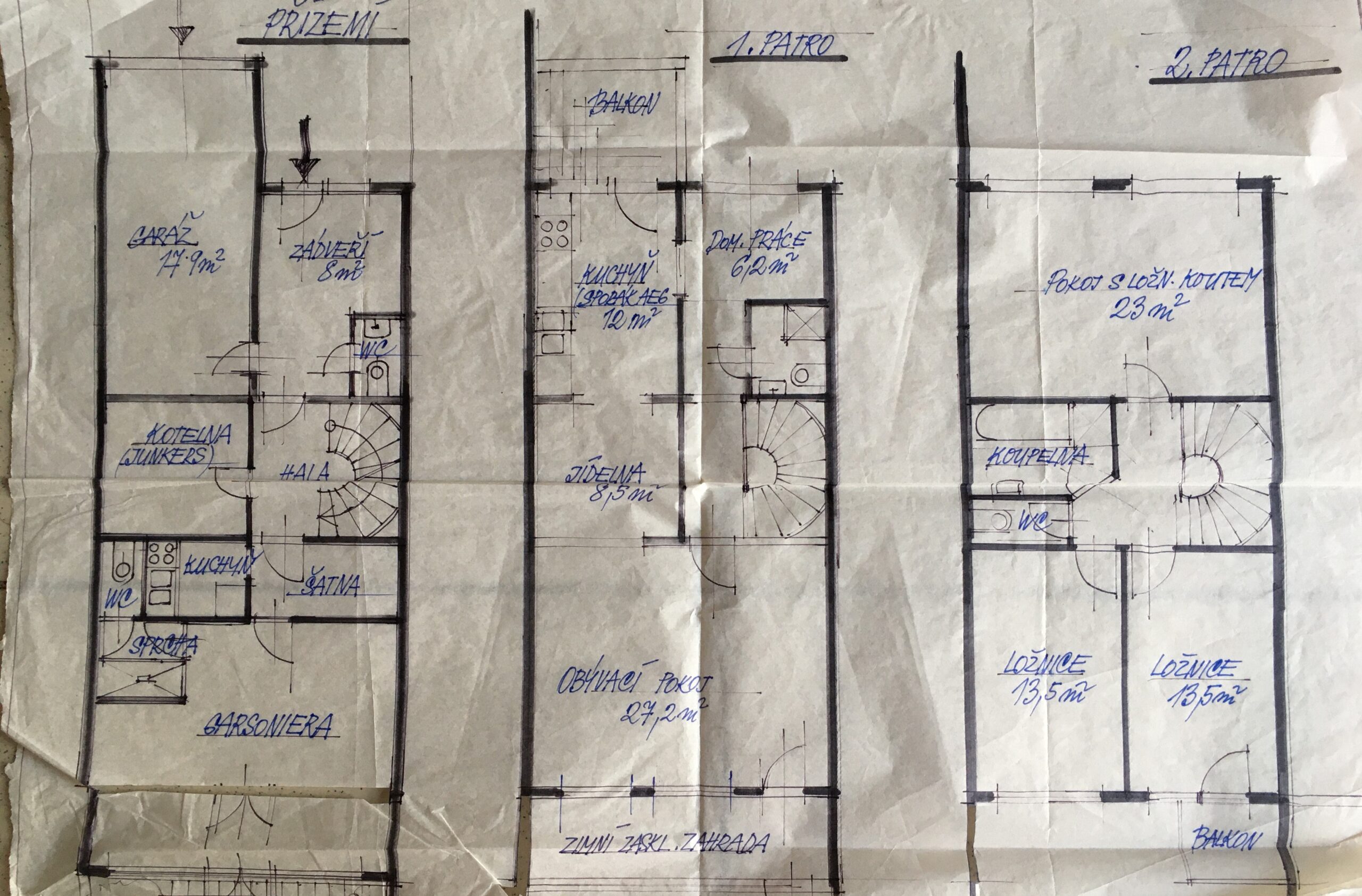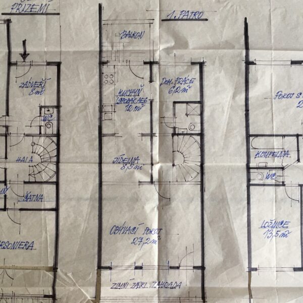 Nejen do prvního patra vede točité schodiště. Tam najdete obývací pokoj s velikou terasou a schody dolů na zahradu, jídelní kout, kuchyni a menší ale velmi praktickou pracovnu. Na tomto patře je koupelna s wc a sprchovým koutem. O patro výš se nacházejí dvě menší ložnice, jeden veliký pokoj a koupelna s dvěma umyvadly, wc a vanou.