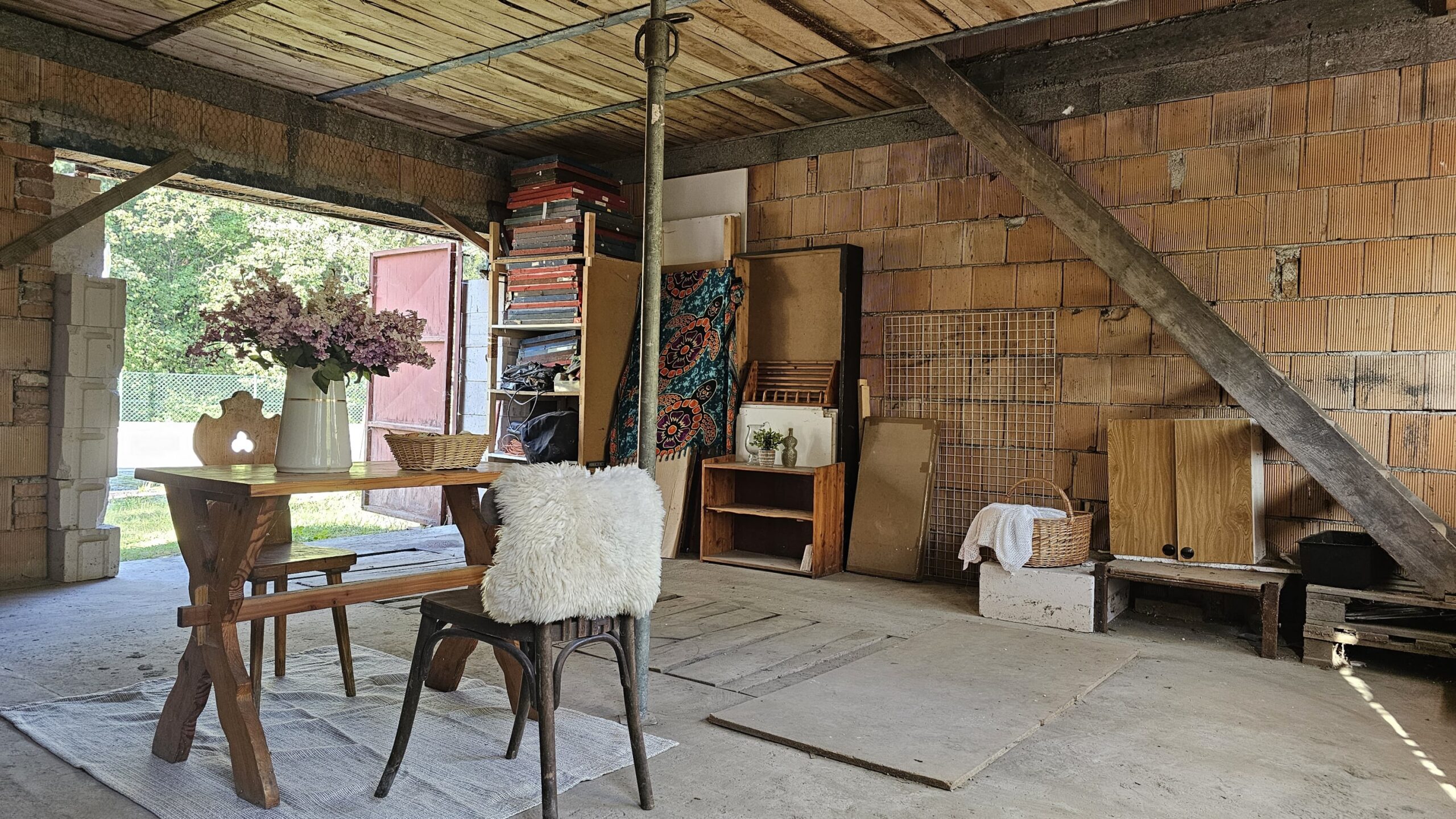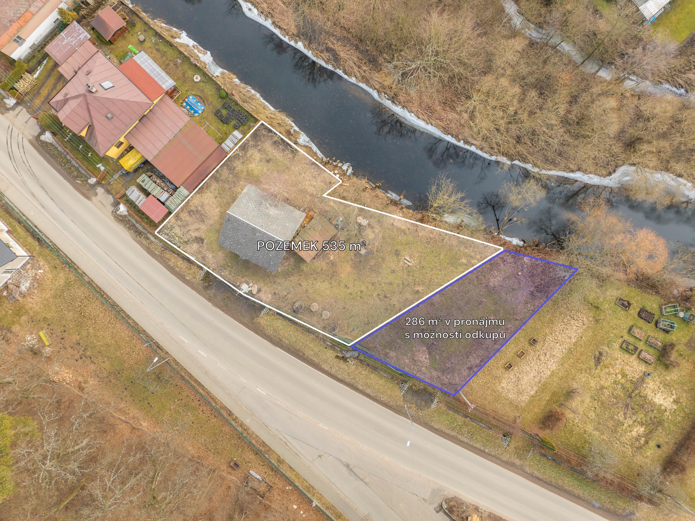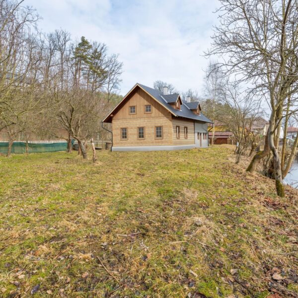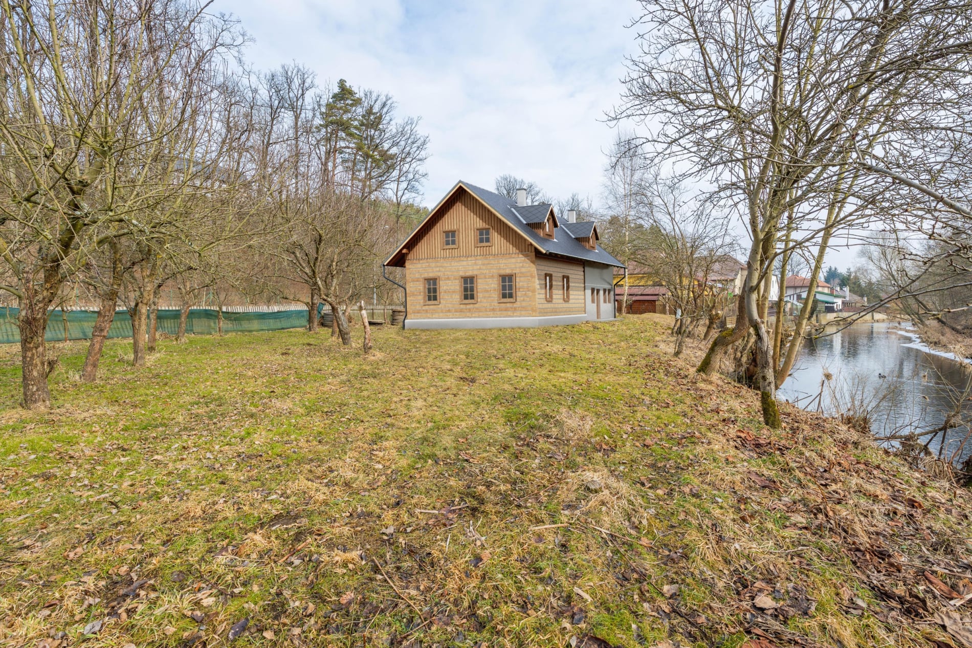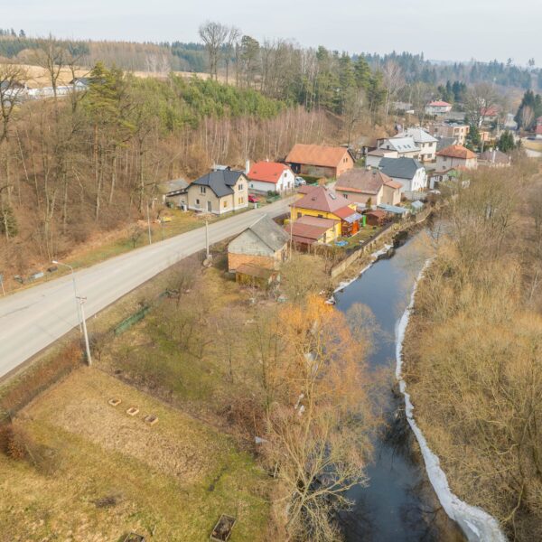 Pozemek je rovný, umístěn přímo u řeky se zvednutým břehem. Přitom díky zvednutým základům nebyla garáž ani při posledních povodních, které byly opravdu extrémní, zaplavená.